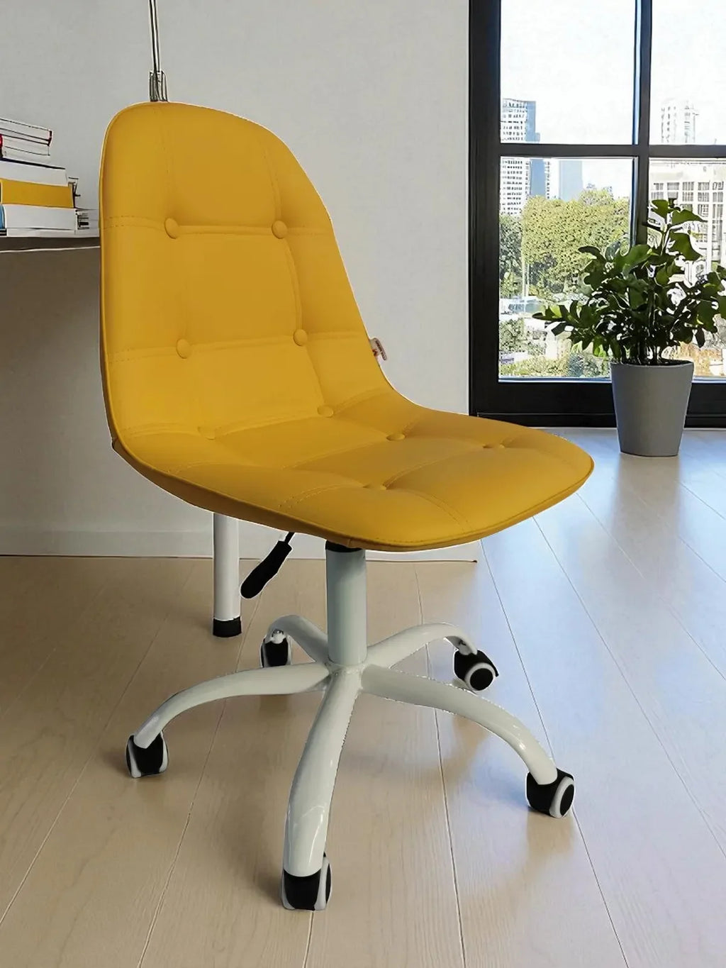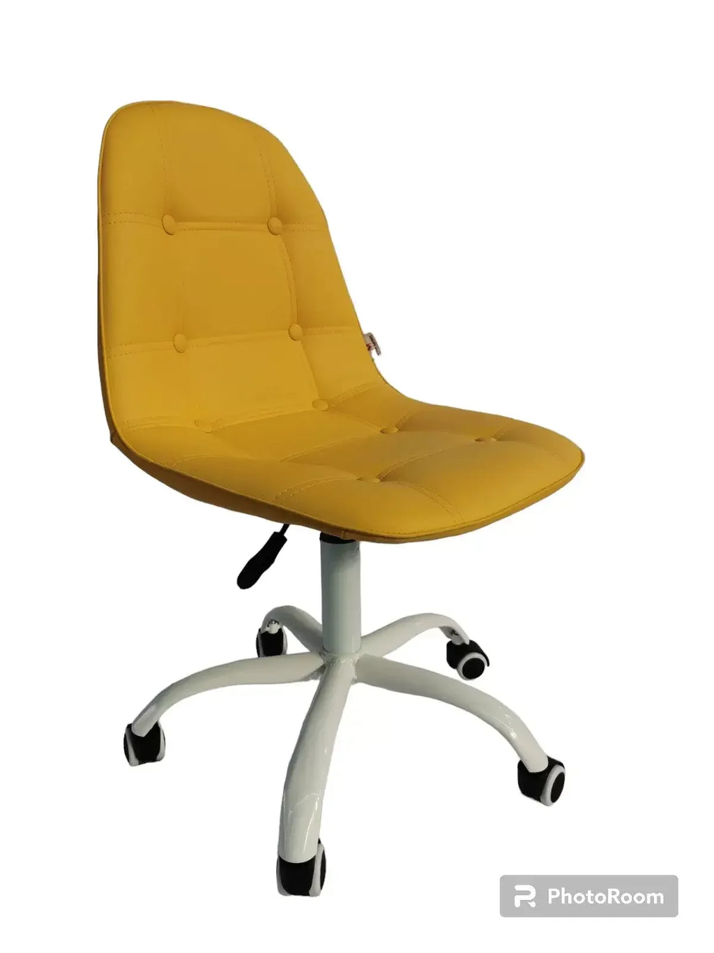 Офис столът Таня е перфектното решение за вашето работно пространство. Със свежа жълта еко кожа и бели крака, този стол съчетава стил, функционалност и комфорт за дълги работни часове.