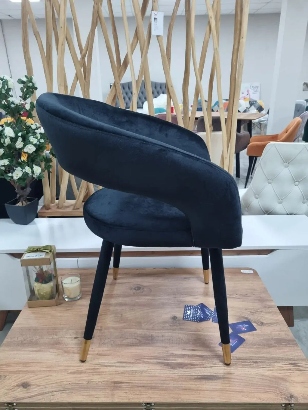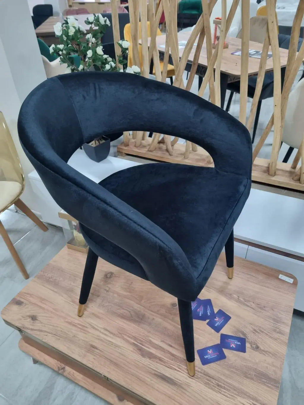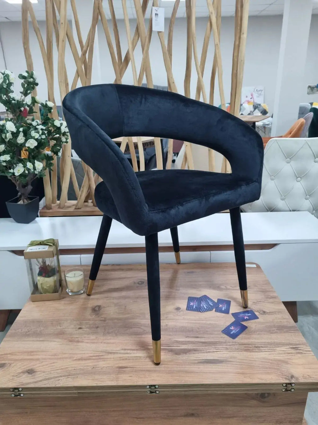 Стол Бени е въплъщение на изтънчения стил и комфорт. С неговата луксозна черна кадифена тапицерия и елегантен дизайн, той ще превърне всяка трапезария в изискано пространство.