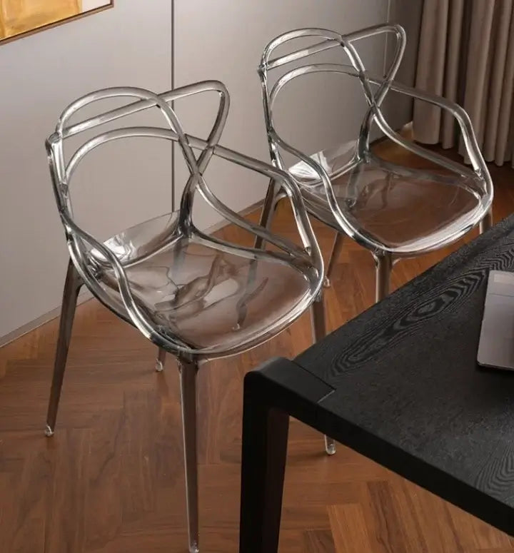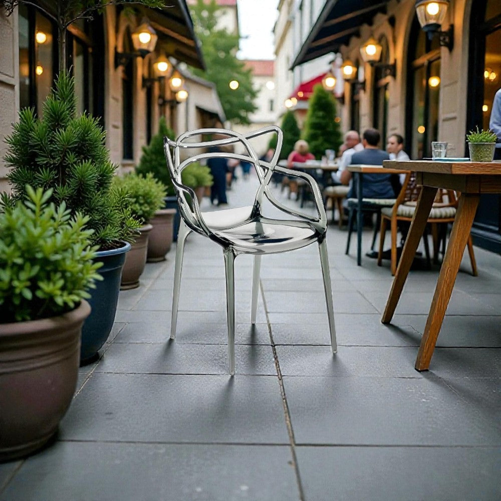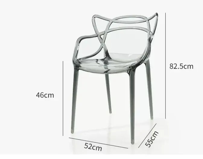 Прозрачният сив кристален поликарбонат придава на стола изискан и съвременен вид. Материалът пропуска светлина, което създава усещане за простор и лекота в помещението. Подлакътниците добавят функционалност и комфорт, правейки стола идеален за продължително седене.