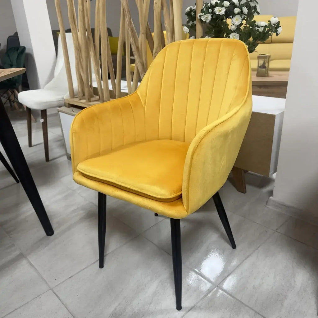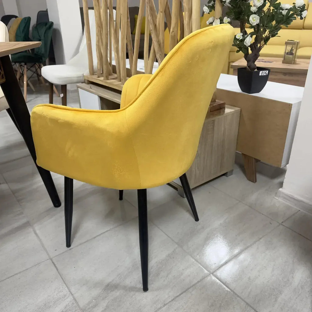 Трапезният стол ВМ313 е перфектното решение за вашата трапезария, кухня или дневна. Изработен с висококачествена жълта кадифена тапицерия, този стол съчетава луксозен вид, комфорт и модерен дизайн.