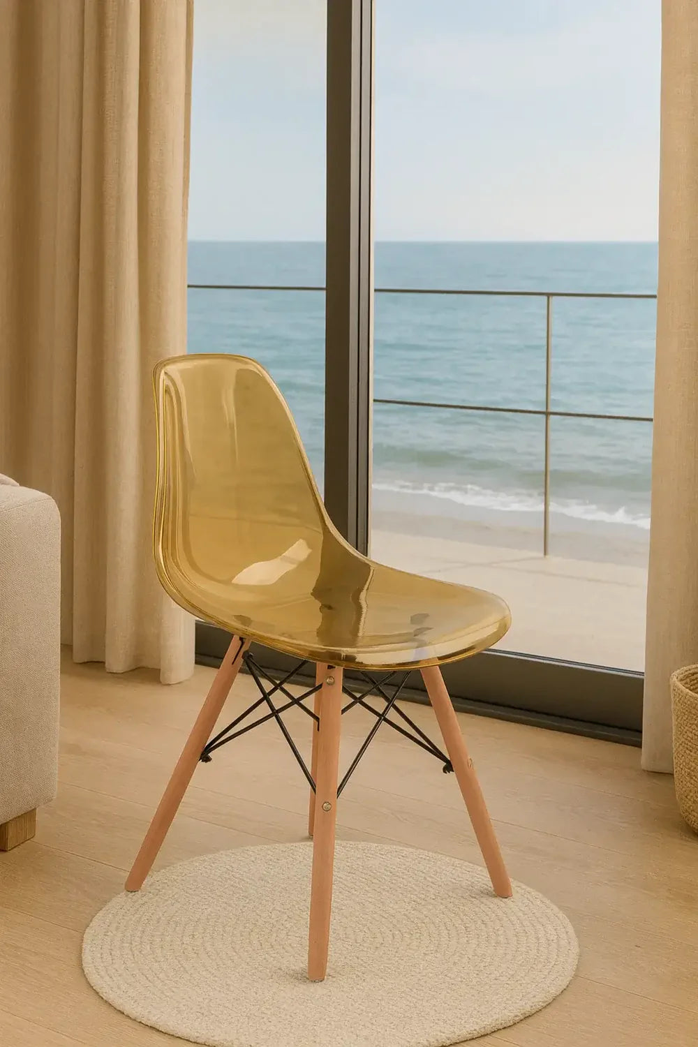 Този емблематичен стол с прозрачна кристална седалка и бели дървени крака е истинска модерна седалка от средата на века. Перфектното съчетание на прозрачност и чистота за вашия дом.