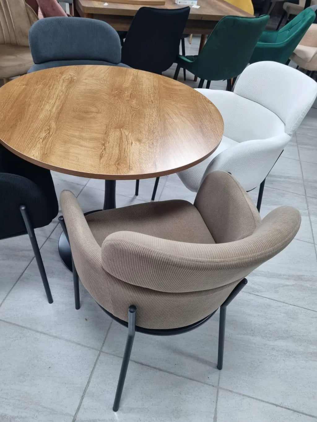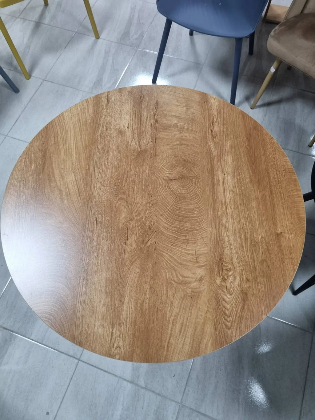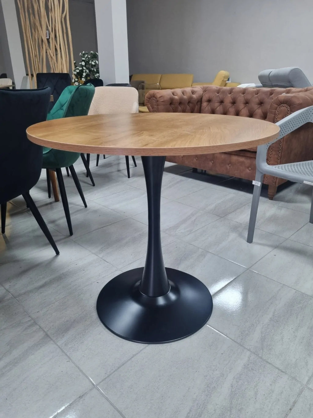 Трапезната маса Мери е перфектно решение за вашата трапезария, кухня или дневна. С кръгъл плот от МДФ в дървесен цвят и елегантна метална основа тип лале, тази маса съчетава модерен дизайн, стабилност и практичност.