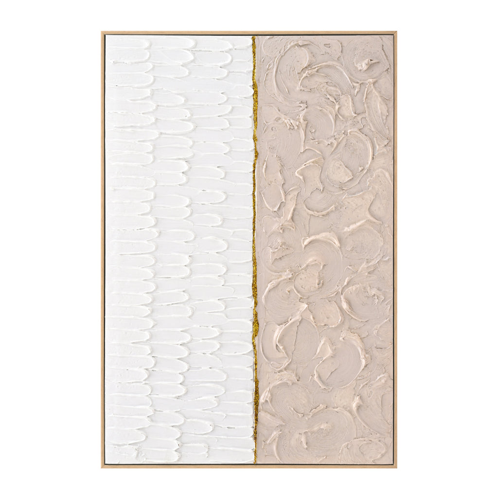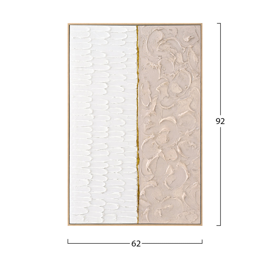 Сред всички декоративни елементи, произведенията на изкуството и особено картините играят важна роля: те не само добавят цвят и естетическа красота, но и придават дълбочина и смисъл на нашето пространство. Една картина трансформира начина, по който възприемаме пространството. Така че, украсете вашето пространство с една от новите картини, добавени към нашата гама! Тази картина е 100% ръчно рисувана и е разделена по средата, като двете страни са съответно БЕЖОВО и БЯЛО. Рамката е БЕЖОВА от полистирен. РАЗМЕРИ: 62х4,5(дебелина)х92см. КОНСТРУКТИВНИ МАТЕРИАЛИ: Полистиролът е вид твърда и солидна пластмаса. ** Цветопредаването на продукта може леко да се различава от неговото фотографско представяне на вашия екран.