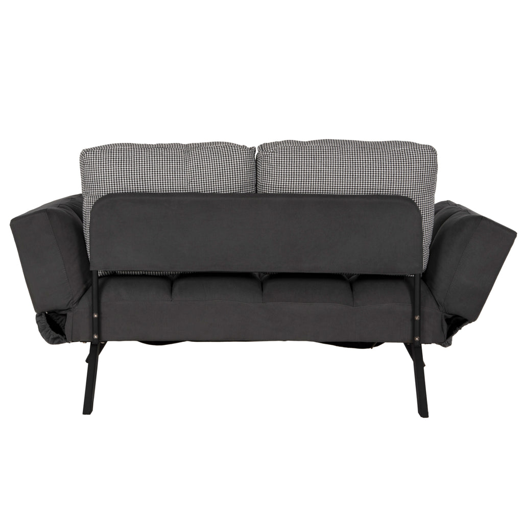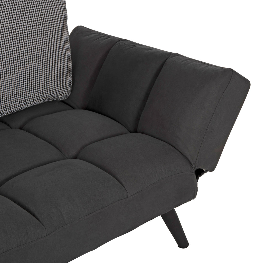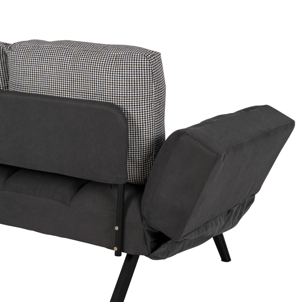 Модерен полиморфен разтегателен диван с подгъващи се рамена, възглавници и тапицерия в сива дамаска. Краката на дивана са метални в черен нюанс, а сгъваемите рамена могат да се регулират като възглавници в различни позиции. Диванът може лесно да се превърне в единично легло или ляво-дясно кушетно легло. Размери: 165-190x75x89H см. Височина на седалката: 40см. Височина на ръцете: 65 см. Размери на седалката: 114-190x55 см. Размери на гърба: 114х46см. Разстояние между краката: 125х73 см. Размери на леглото: 190х55 см.