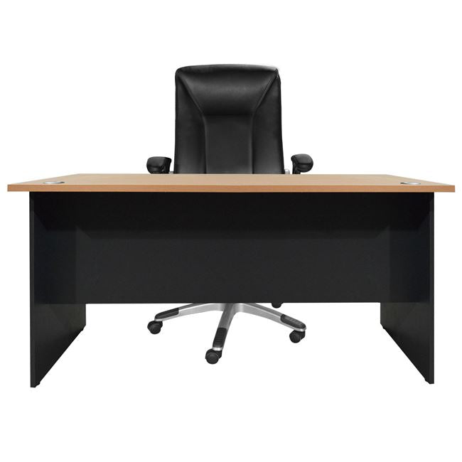 Плот от меламин с дебелина 25мм в цвят бук, с два кабелни входа над краката. Меламинови крака с дебелина 18 мм в сив цвят.