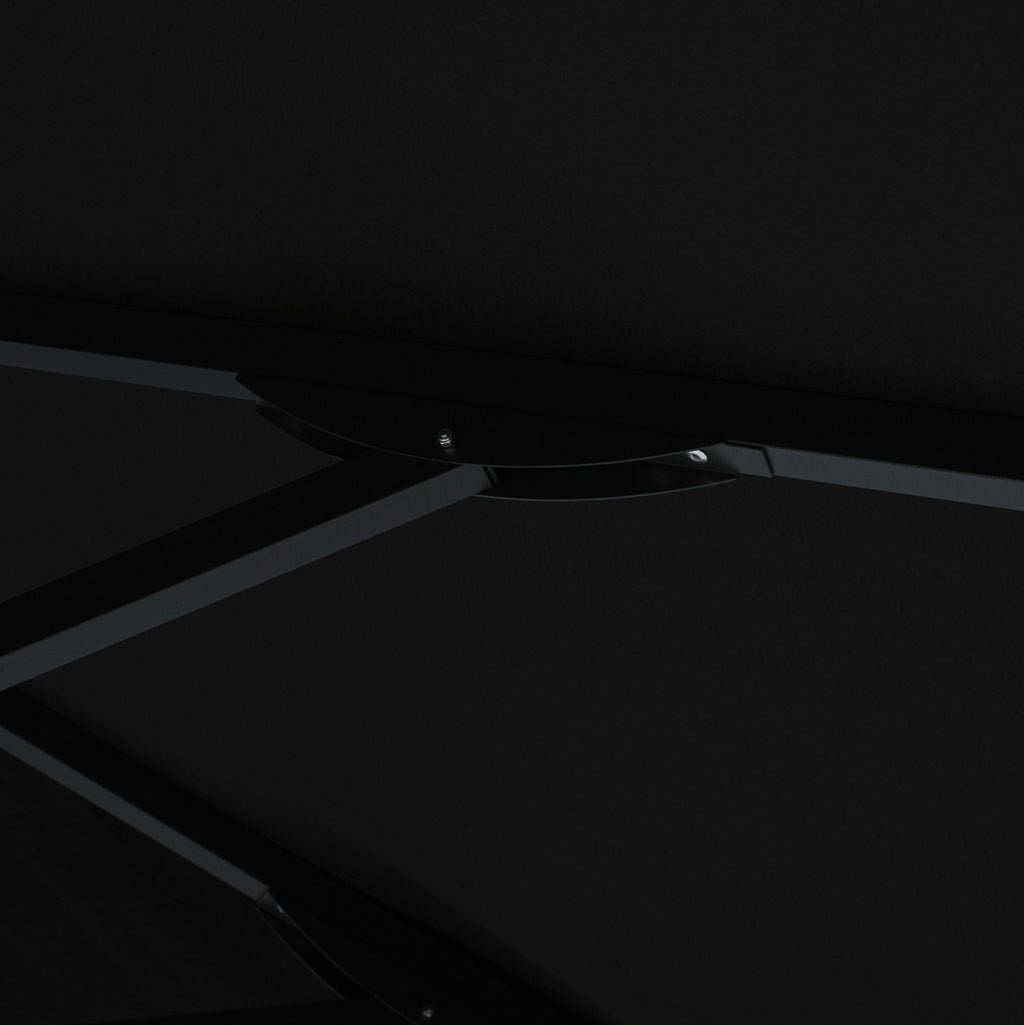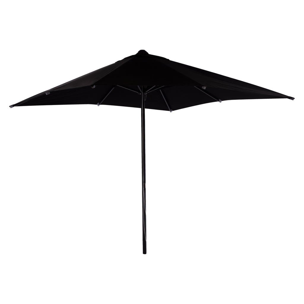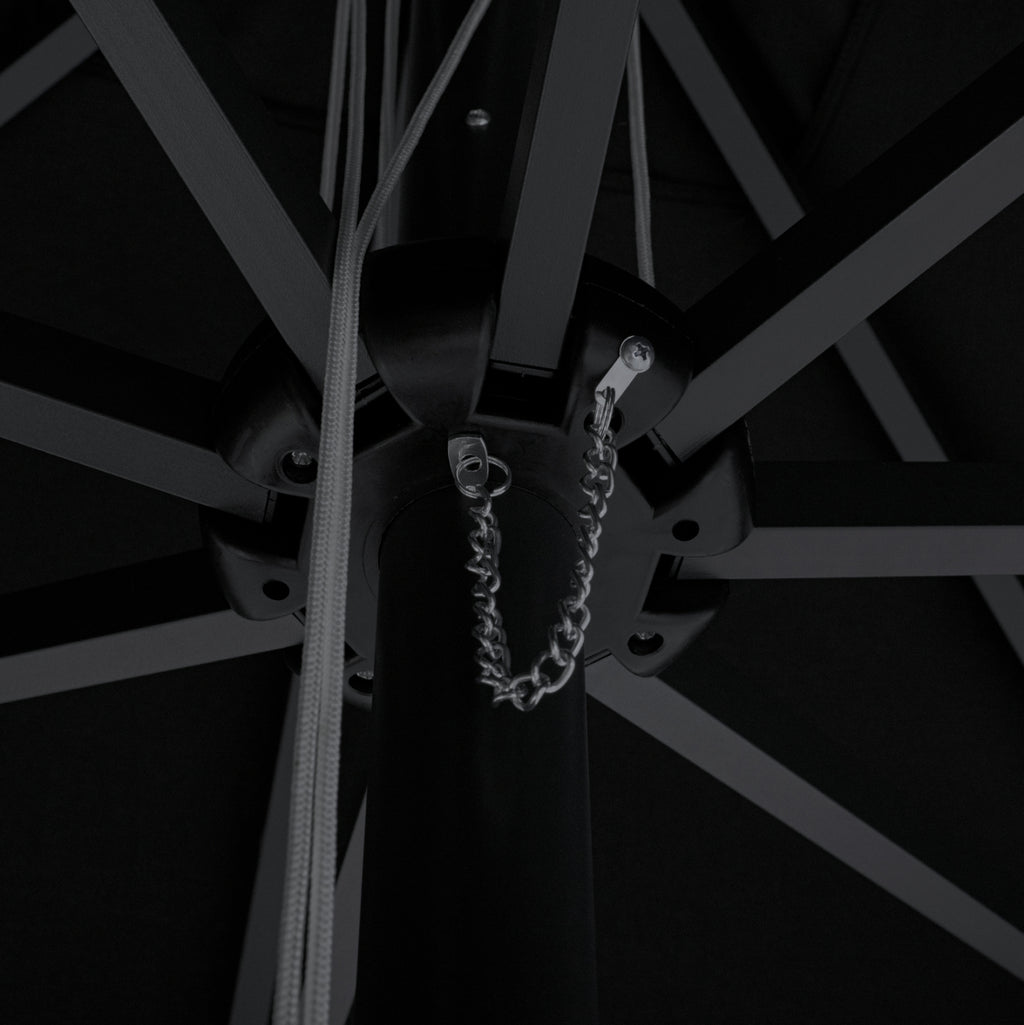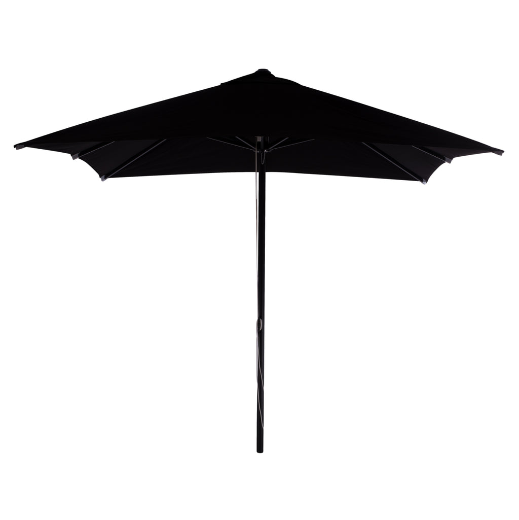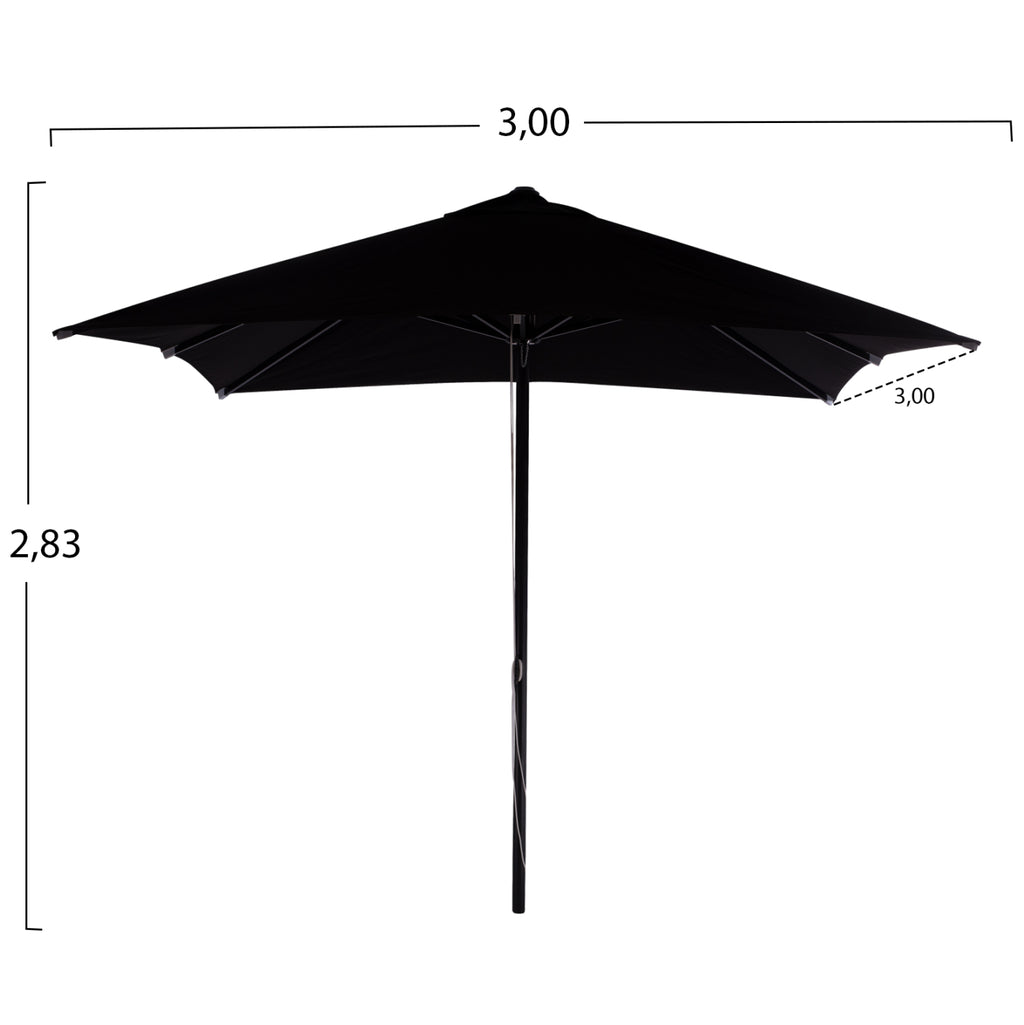 Професионален квадратен алуминиев чадър 3x3x2.83Y m. с черен акрилен плат. Размер на алуминиевата рамка: Φ50x1.5 мм. Спици 8: 18x28x1 mm подсилени с вътрешна гума 14x24x50 cm. Плат: Черен акрил 250 гр. с вентилационен отвор С 3 нива на регулиране на височината Подходящ за плажни барове и за всякаква професионална употреба Забележка: Чадърът е подходящ за използване при открито време. При нестабилно време чадърът трябва да бъде затворен. Чадърът не подлежи на ремонт.