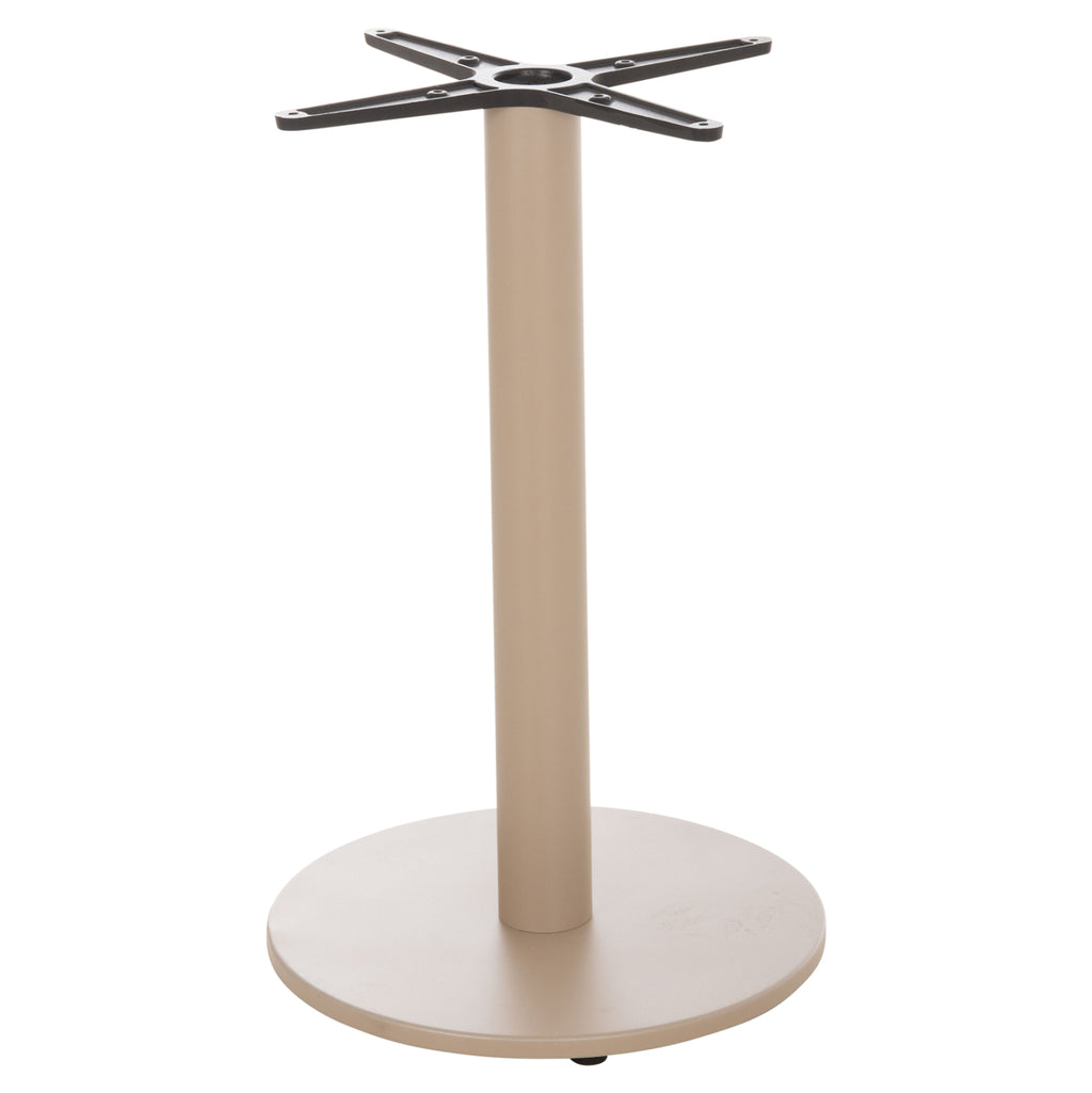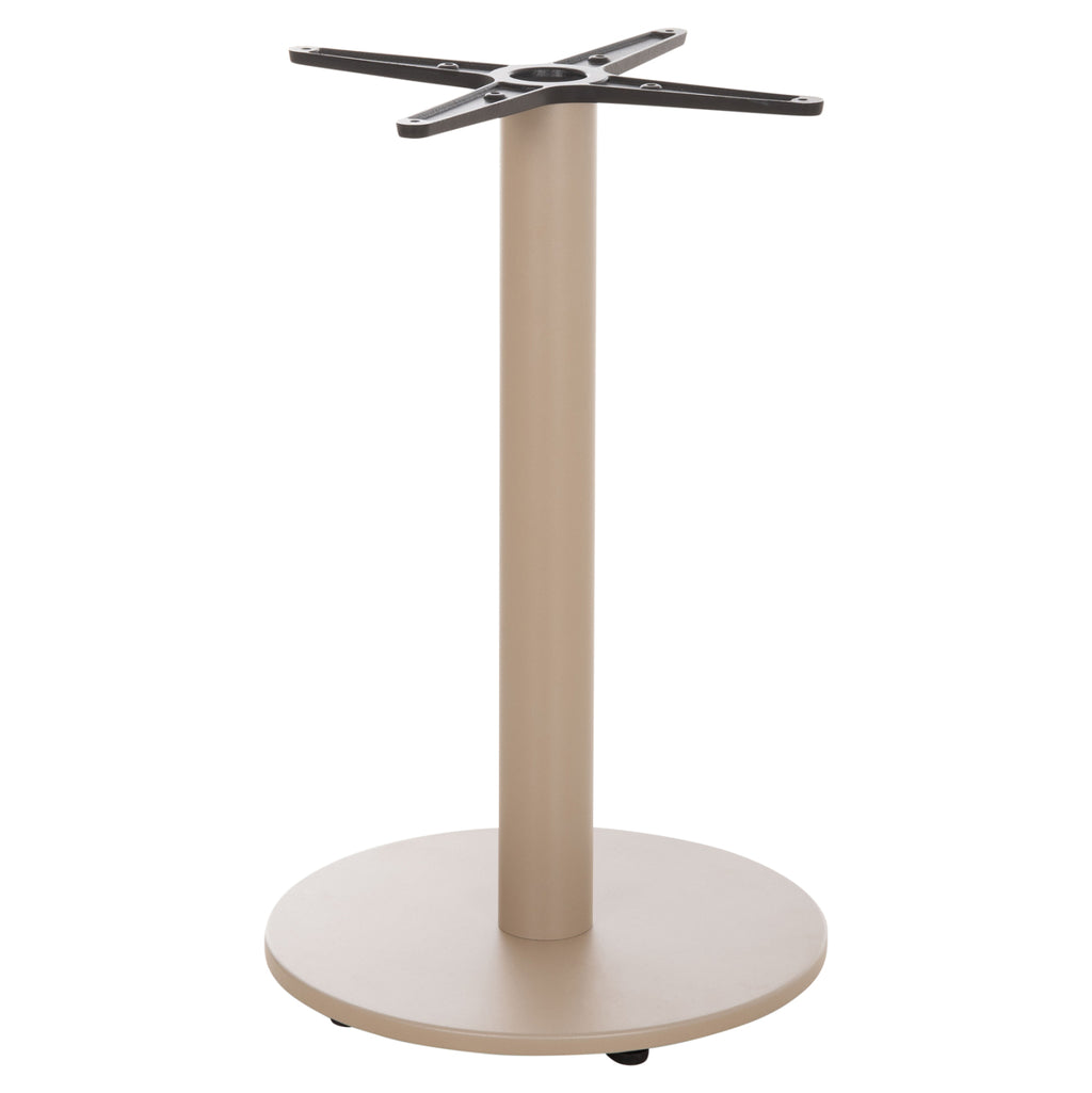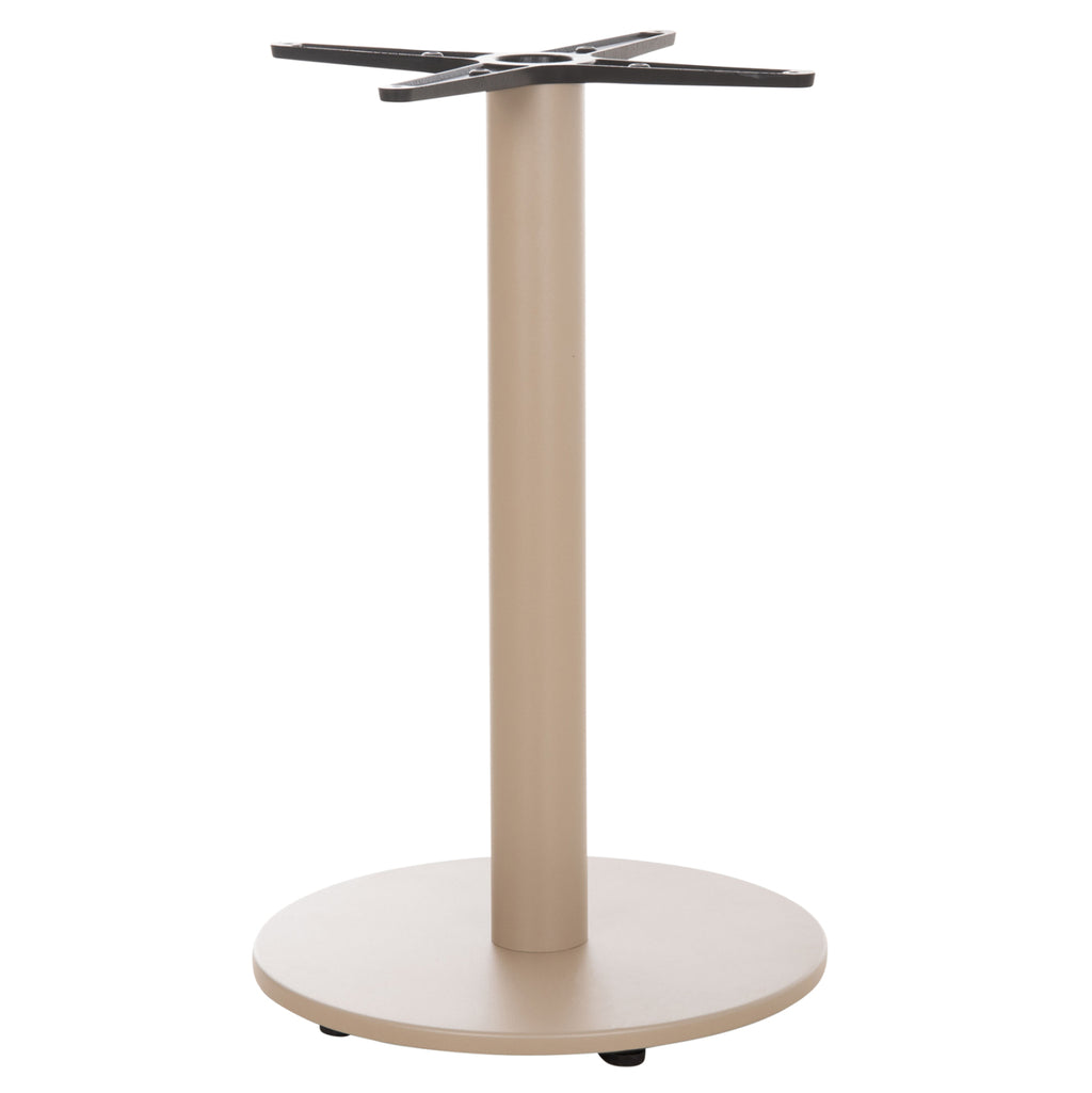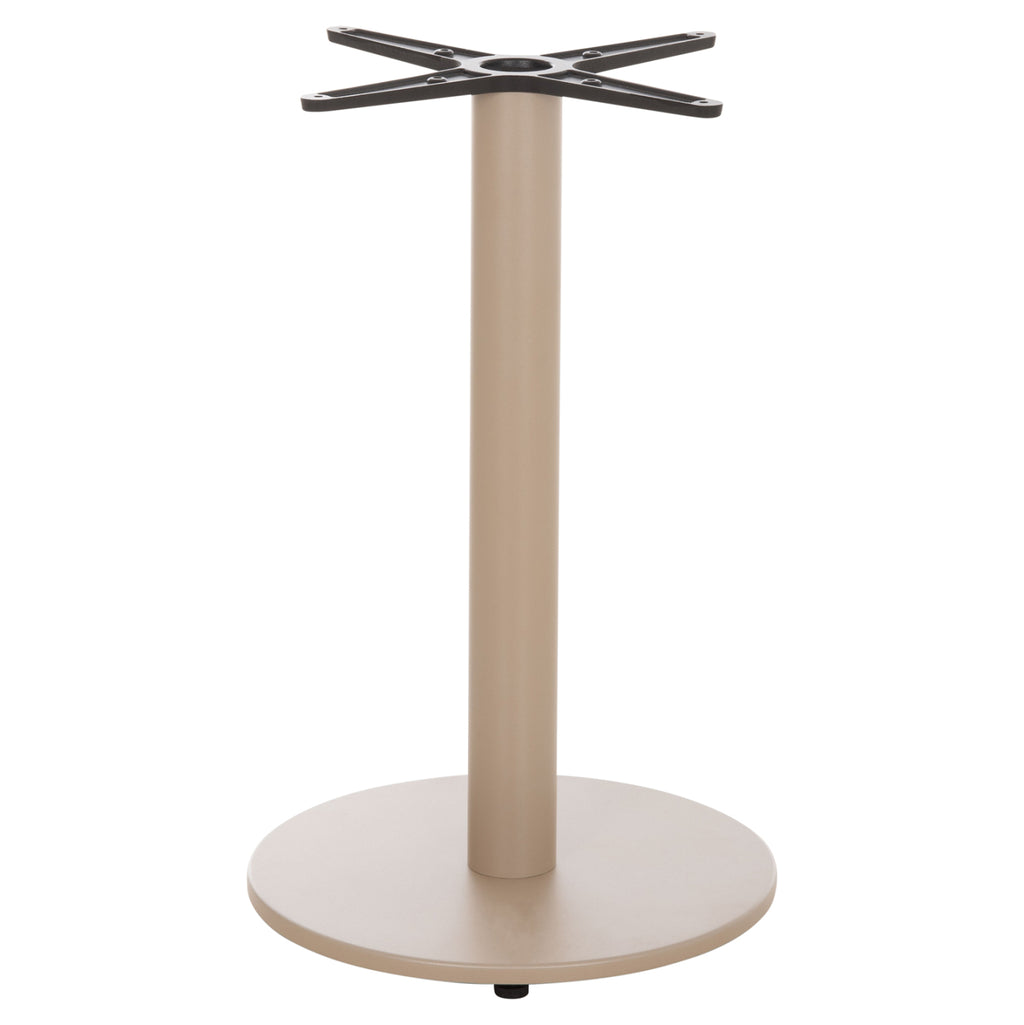 Кръгла основа за маса в цвят КАПУЧИНО. Тази основа е алуминиева с електростатично боядисване, с колона, която се опира на тежка, равна алуминиева повърхност. Избраният от вас капак се опира на “кръст”, така че може да приема както кръгли, така и квадратни капаци. Също така има регулатори на височината в долната част. Идеална за комбинация с повърхности от почти всякакъв тип, като например версалити, HPL, MDF и др.