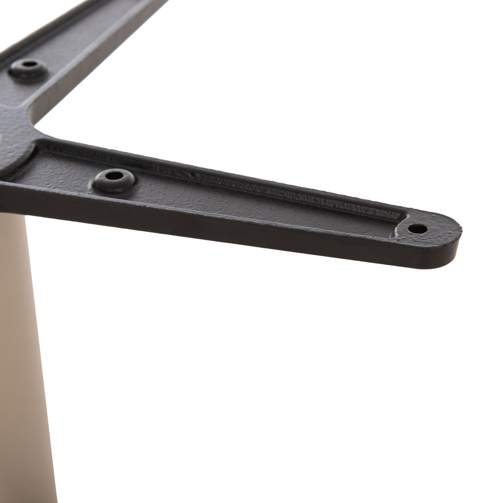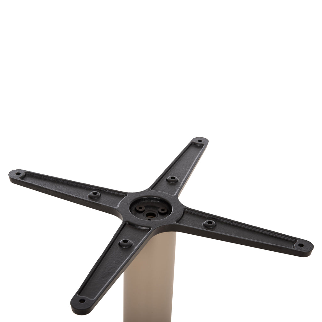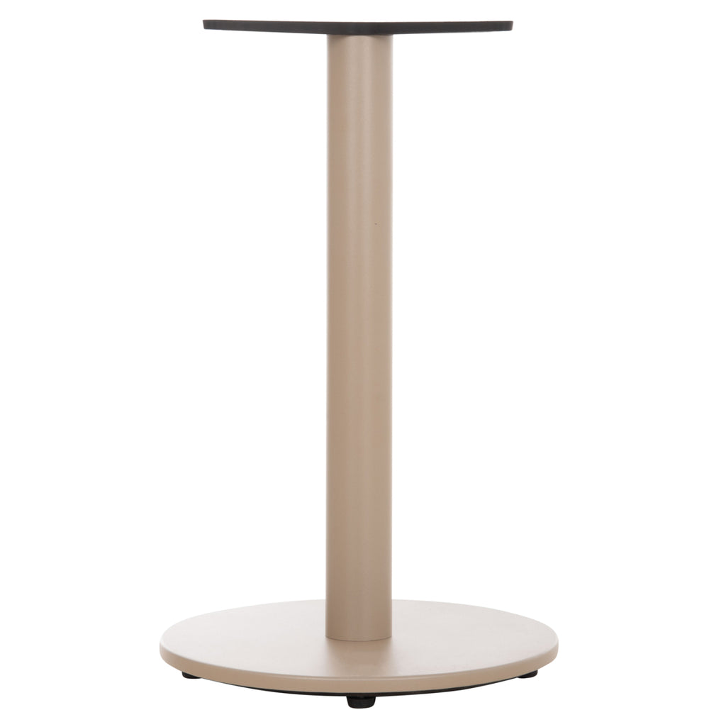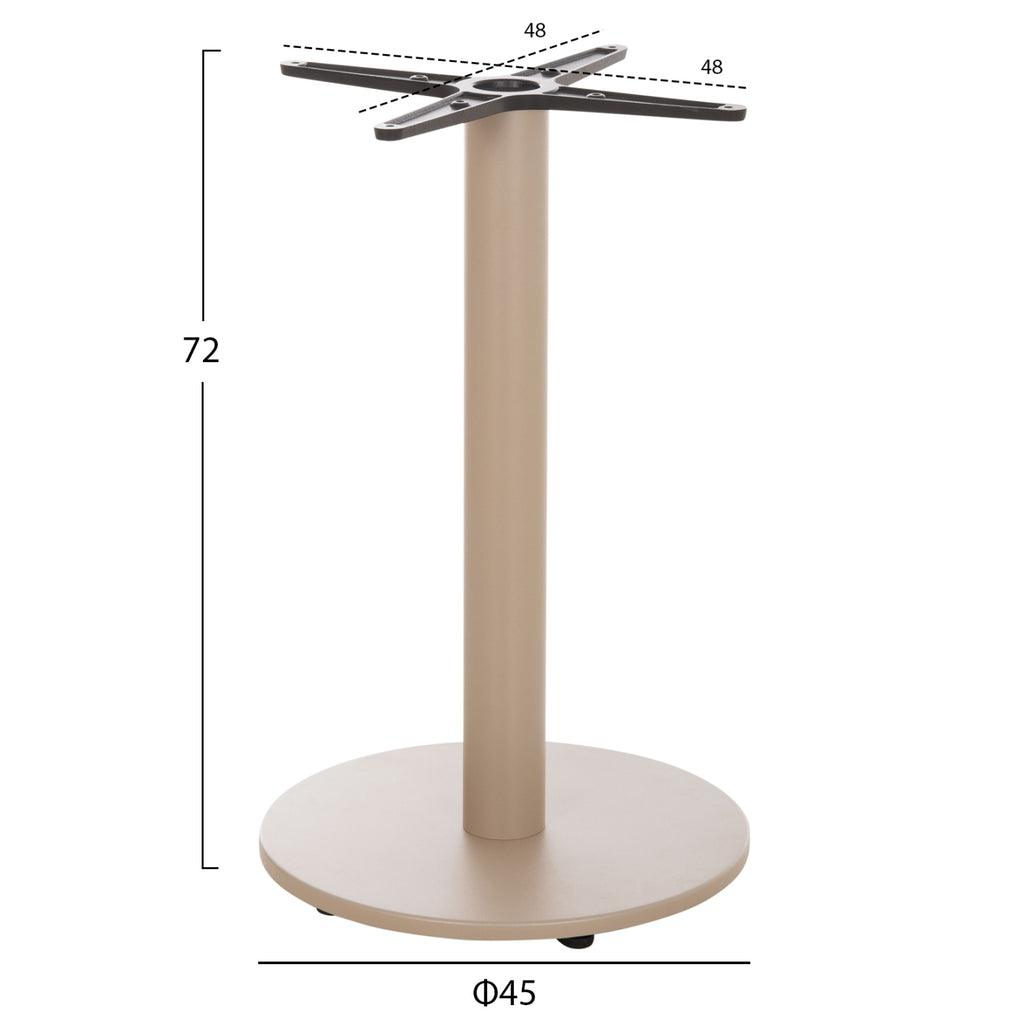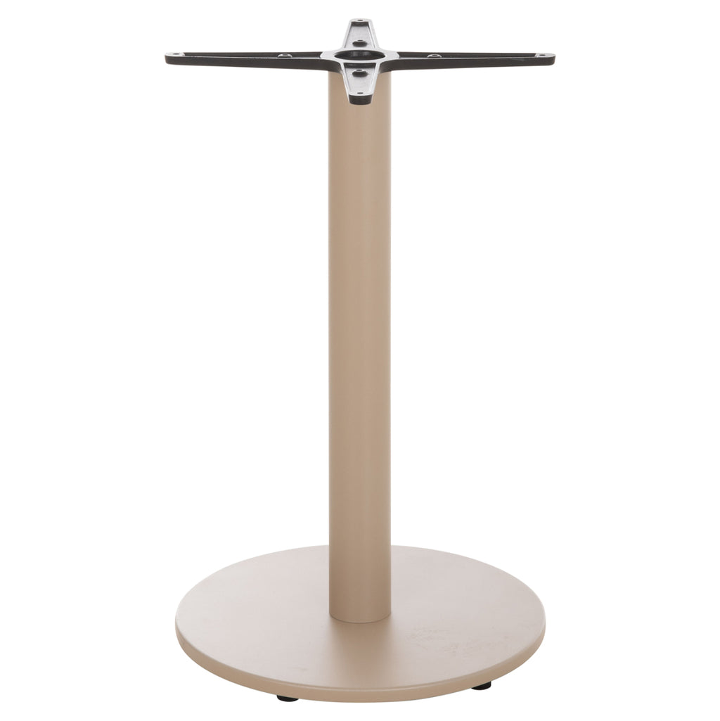 Кръгла основа за маса в цвят КАПУЧИНО. Тази основа е алуминиева с електростатично боядисване, с колона, която се опира на тежка, равна алуминиева повърхност. Избраният от вас капак се опира на “кръст”, така че може да приема както кръгли, така и квадратни капаци. Също така има регулатори на височината в долната част. Идеална за комбинация с повърхности от почти всякакъв тип, като например версалити, HPL, MDF и др.