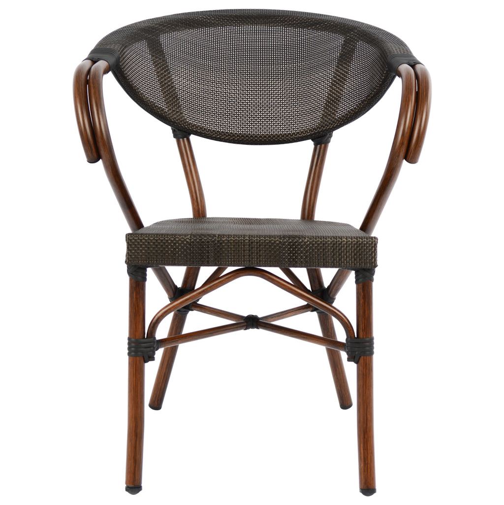 "Bamboo Look" алуминиево кресло за открито с голяма устойчивост на слънце и дъжд. Изработена е от алуминиева рамка и боядисана, за да придаде вид на дърво. Размери: 60.5x59x81 см. Височина на седалката: 43,5 см. Височина на ръцете: 71 см. Водоустойчив текстил на облегалката и седалката 4x4 Алуминий размери: Φ 0.28x1.50 мм. Цвят на рамката: Имитация на дърво. Цвят на плата: Кафяв