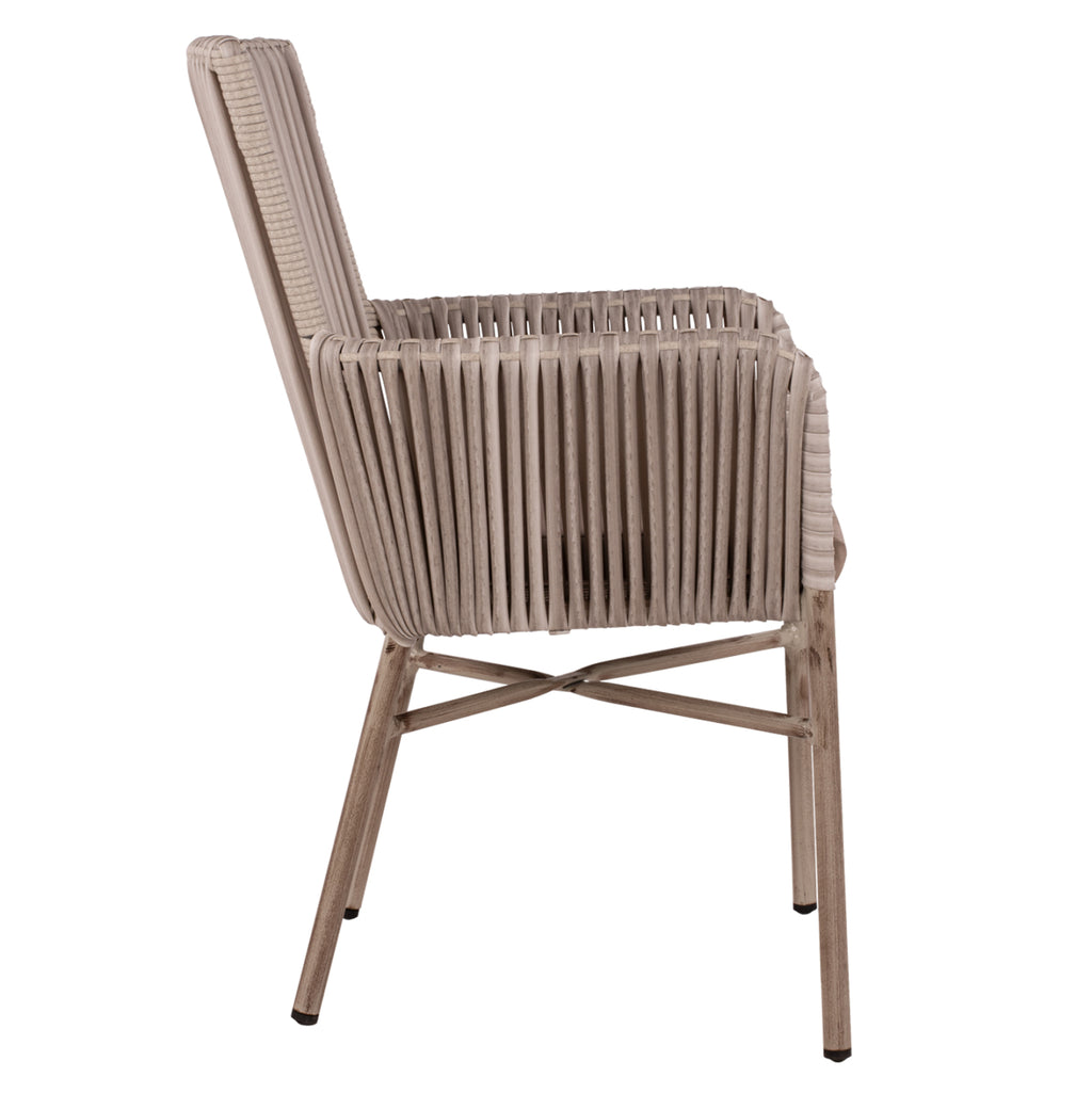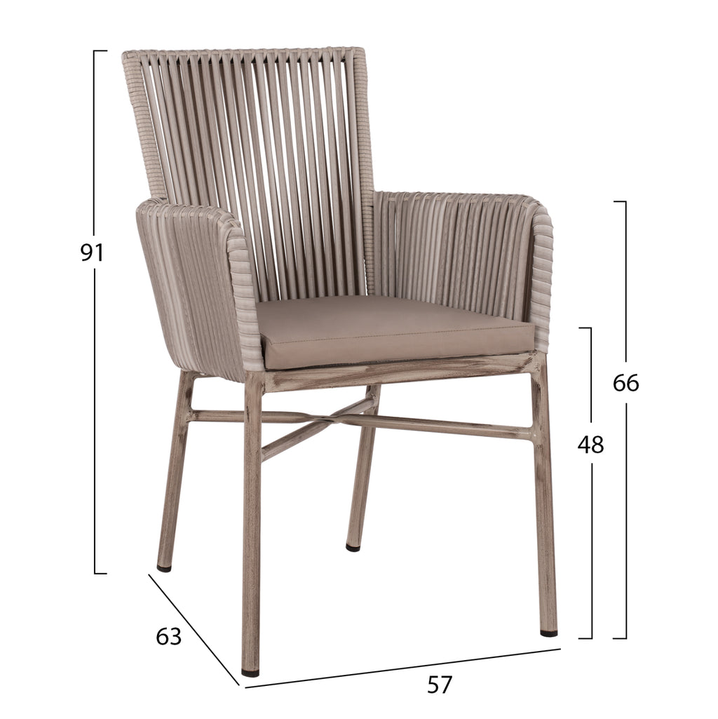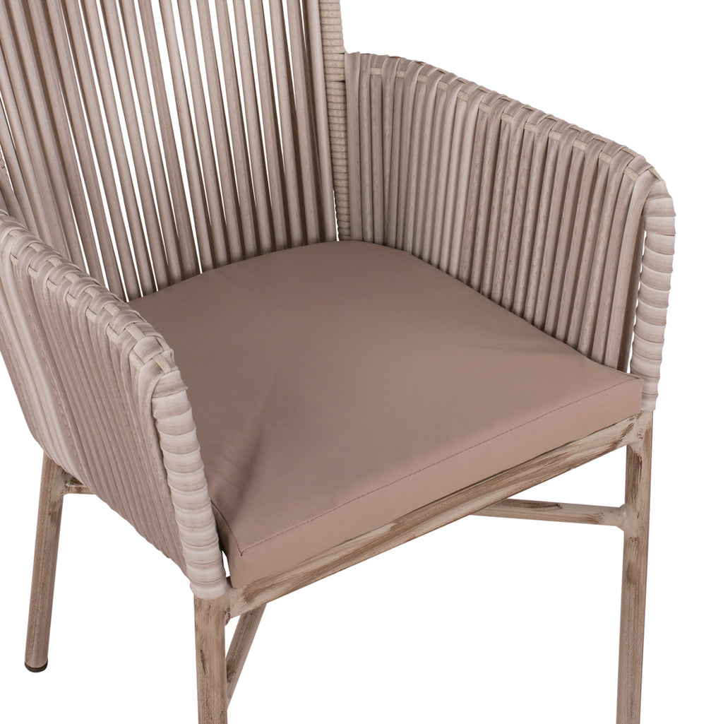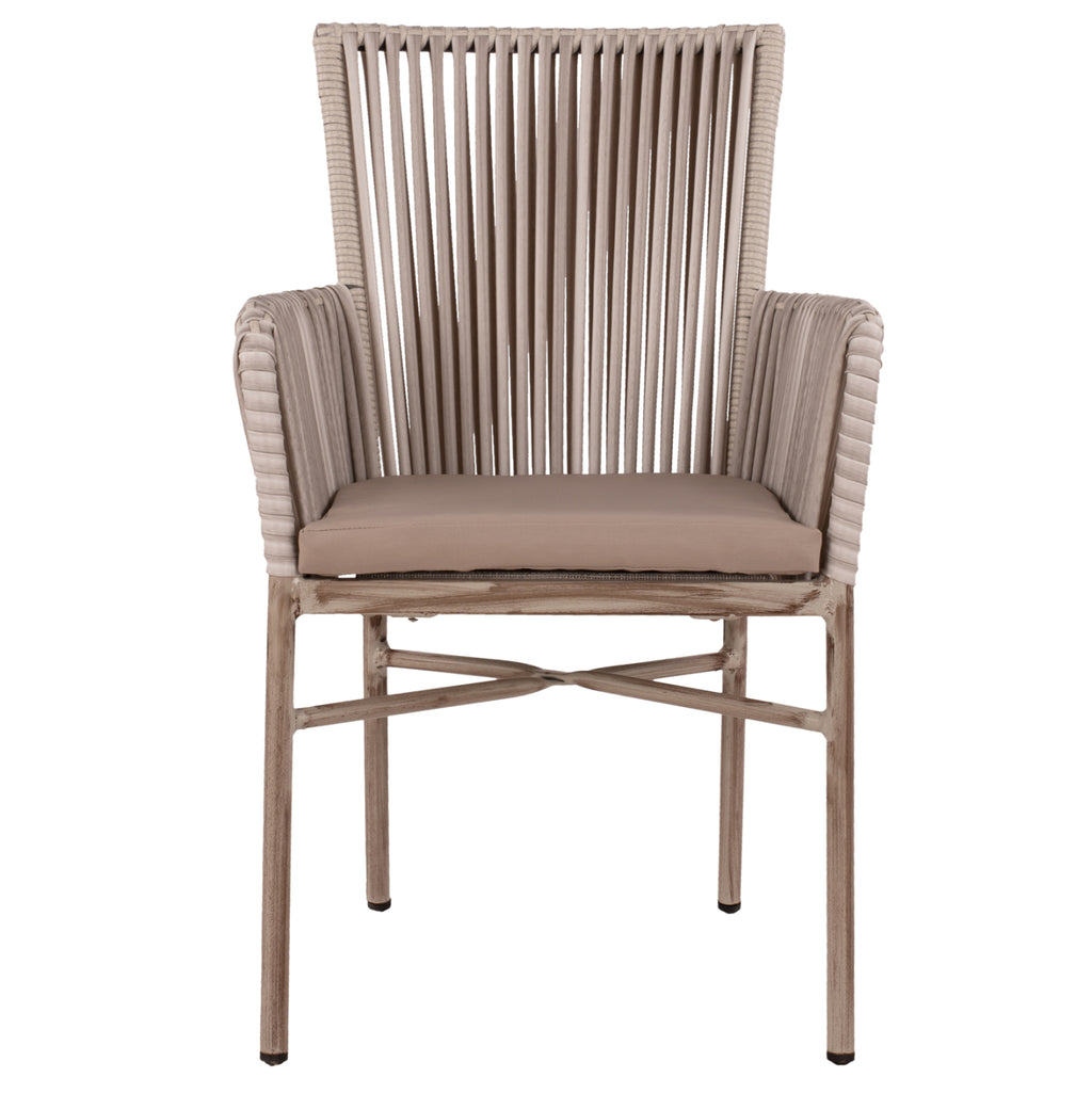 Модерно външно кресло, изработено от алуминиева конструкция в сив патиниран нюанс и покрито с плетена ракита в светло сив цвят. Има и pvc подложка textileline в сив цвят с дебелина 5см. Модерната линия на стола придава нотка на италианска изисканост. Ракитата има голяма устойчивост на високи и ниски температури от (-85c до +85c.), обогатена е и с UV стабилизатор за слънчевите лъчи. Идеален за трапезария, но и за вашия дом, той ще ви даде комфорт и почивка. Размери: 57х63х91см. Височина на седалката: 48см. Височина на ръцете: 66 см. Размери на седалката: 42х44 см. Дебелина на възглавницата: 5см.