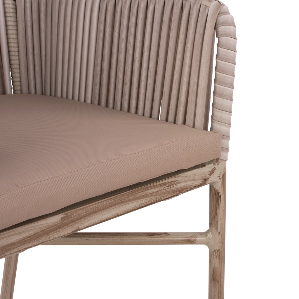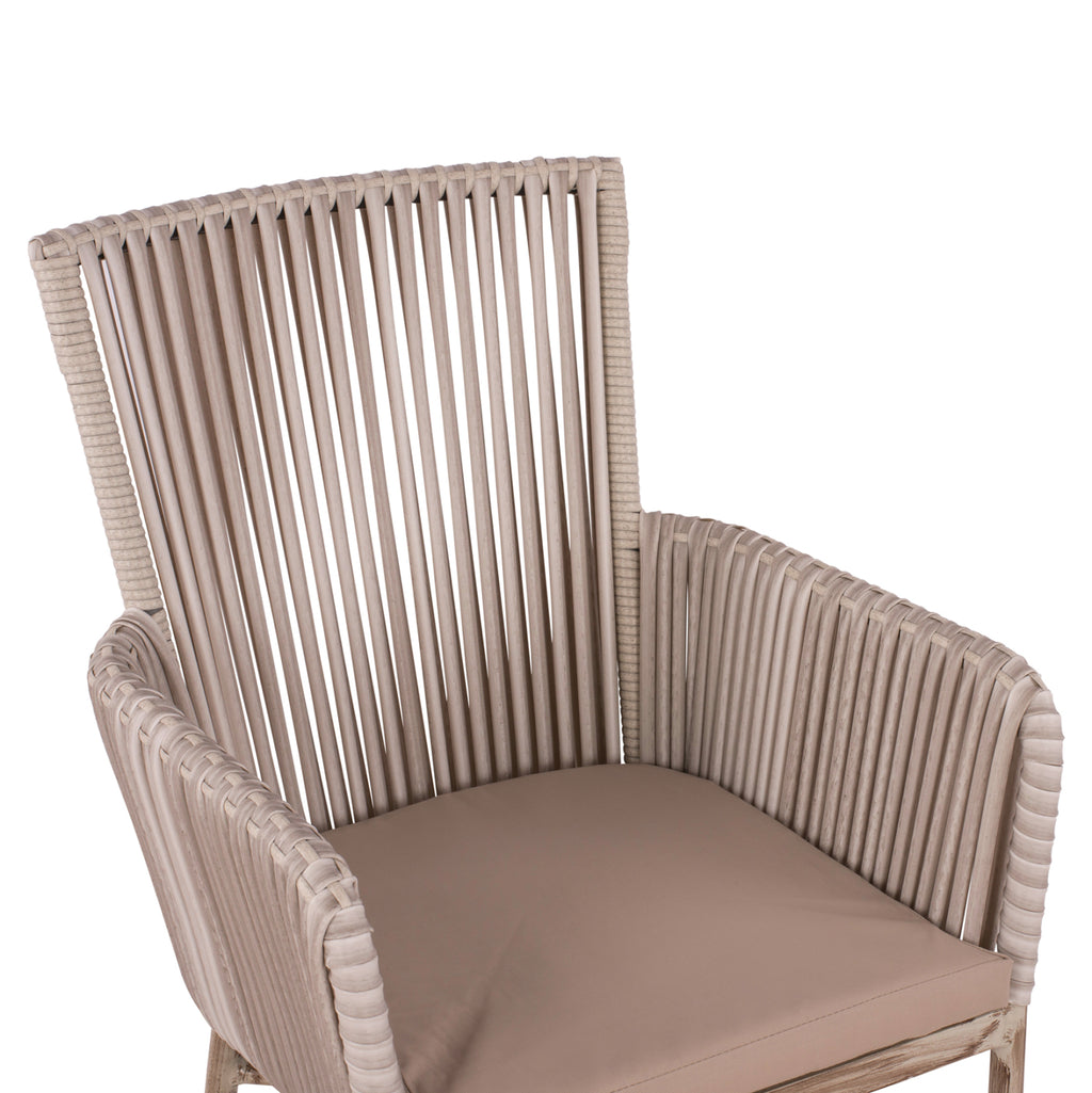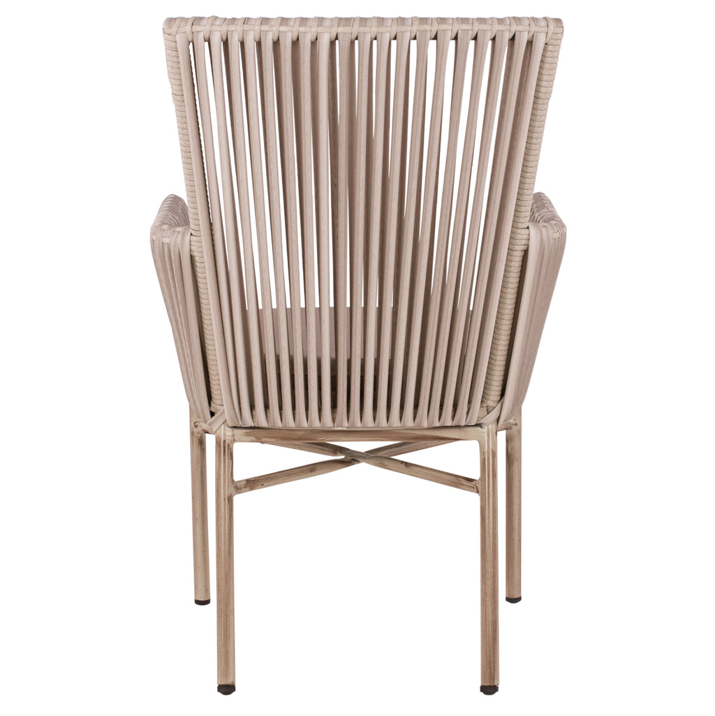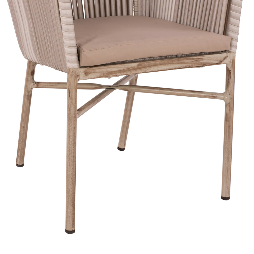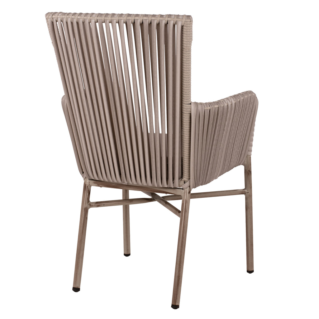 Модерно външно кресло, изработено от алуминиева конструкция в сив патиниран нюанс и покрито с плетена ракита в светло сив цвят. Има и pvc подложка textileline в сив цвят с дебелина 5см. Модерната линия на стола придава нотка на италианска изисканост. Ракитата има голяма устойчивост на високи и ниски температури от (-85c до +85c.), обогатена е и с UV стабилизатор за слънчевите лъчи. Идеален за трапезария, но и за вашия дом, той ще ви даде комфорт и почивка. Размери: 57х63х91см. Височина на седалката: 48см. Височина на ръцете: 66 см. Размери на седалката: 42х44 см. Дебелина на възглавницата: 5см.