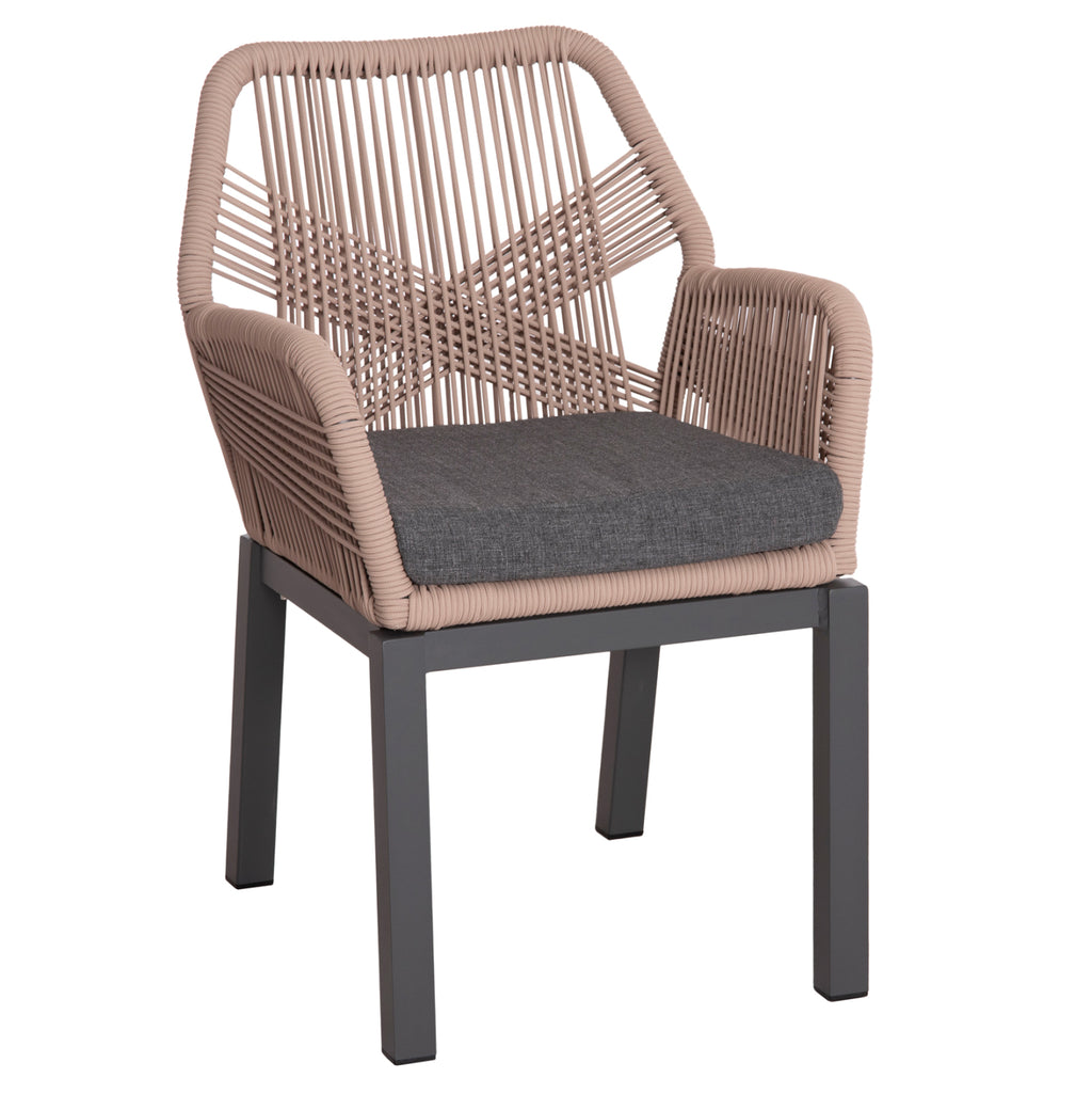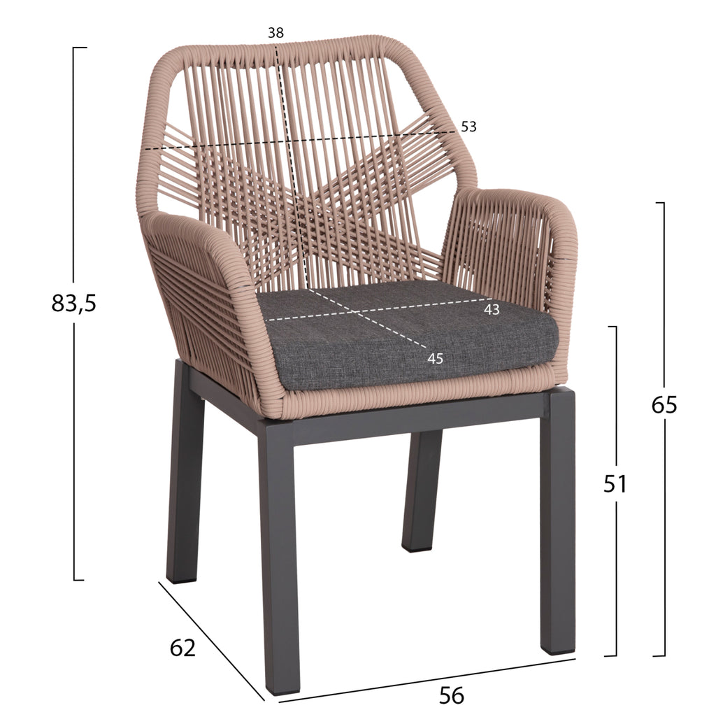 Кресло HOWARD е с алуминиева конструкция CARBON и удобна възглавница за седалка в същия цвят. Гърбът и ръцете са изработени от плетено въже TEXTILENE в БЕЖОВ цвят. Идеален за трапезарии, но и за вашия дом, той ще ви даде комфорт и релакс с възможно най-високо качество на материалите и довършителните работи. РАЗМЕРИ: 56x62x83.5H см. Размери на седалката: 43х45 см. Размери на гърба: 53х38см. Височина на ръцете: 65 см. Височина на седалката: 51 см. Височина на крака: 36 см. Разстояние на краката: 47-39х56,5-48,5 см. Дебелина на възглавницата: 5см. МАТЕРИАЛИ НА КОНСТРУКЦИЯТА: Рамката е изработена от алуминий. Алуминият е „зелен“ материал, който може да се рециклира неограничено време, като запазва характеристиките си без влошаване на качеството. По своята същност е устойчив на корозия. Въжето е изработено от текстил и е водоустойчиво, като същевременно има UV защита за издръжливост и несравнима устойчивост на открито. ПОДДРЪЖКА: Фотьойлът не се нуждае от много поддръжка благодарение на удобните за употреба и издръжливи материали. В идеалния случай използвайте много мека кърпа или гъба, обилно количество вода и мек почистващ продукт, като препарат за миене на съдове. Няма особени изисквания за поддръжка, тъй като не корозира. Сапунът и водата са достатъчни, за да го поддържате чист и блестящ. *Столът се доставя несглобен във фабрична опаковка ** Цветопредаването на продукта може леко да се различава от фотографското представяне на вашия екран.