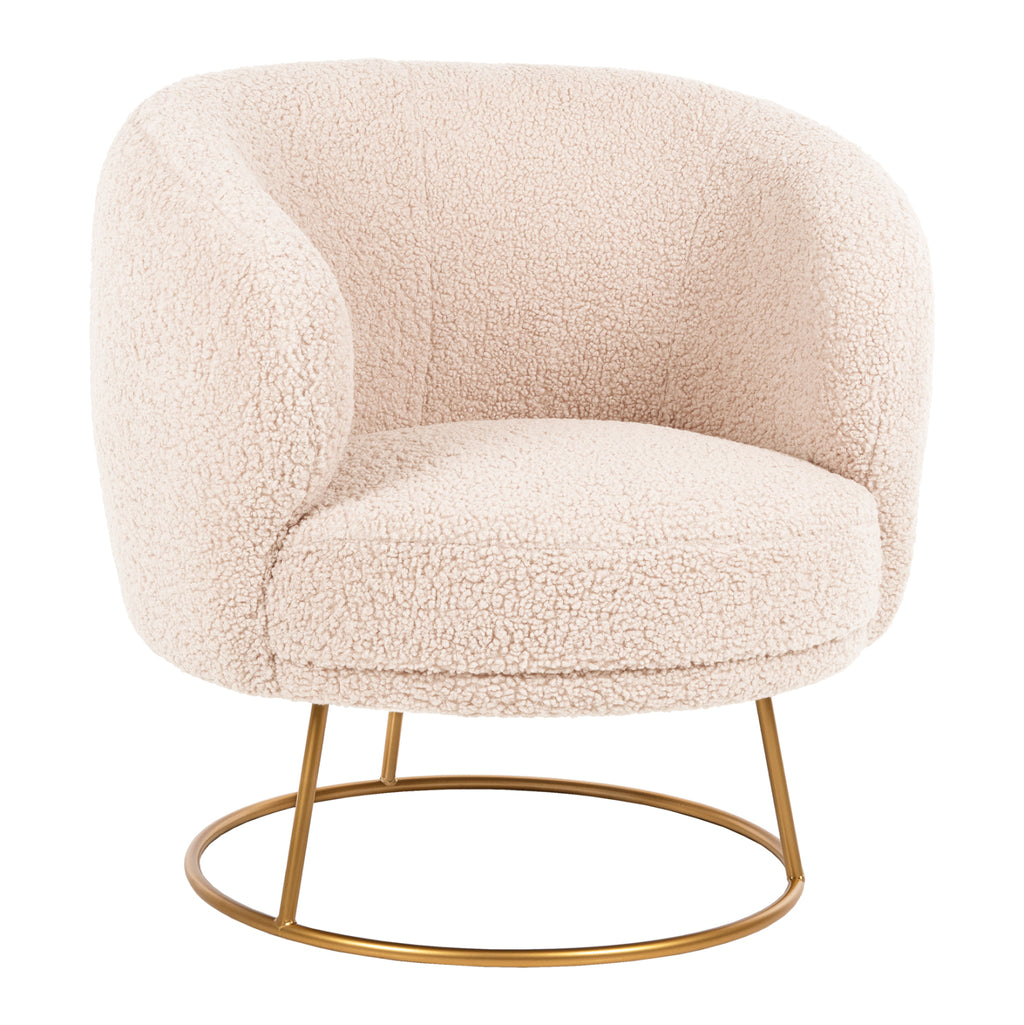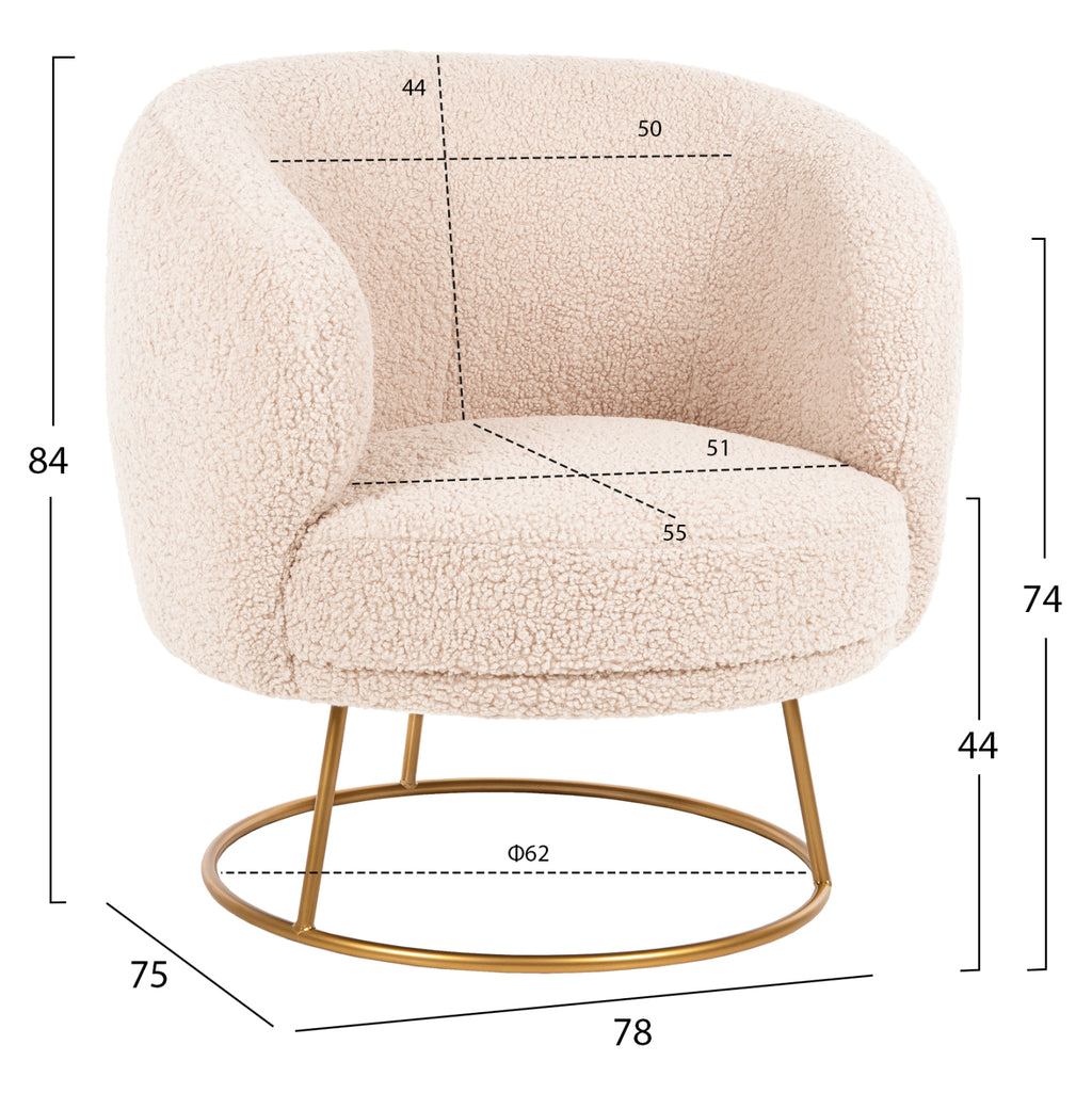 Кресло ARIEN е модерно и стилно кресло, което ще остави своя отпечатък във всяка всекидневна, където бъде поставено. Кръглата му форма с кръгла метална основа, съчетана с нисък гръб и равни ръце, "прегръщат" тялото и предлагат комфорт и стил. Неутралният КРЕМАВ цвят със ЗЛАТНОТО на основата може да се комбинира с множество други цветове в декорацията на всекидневната.