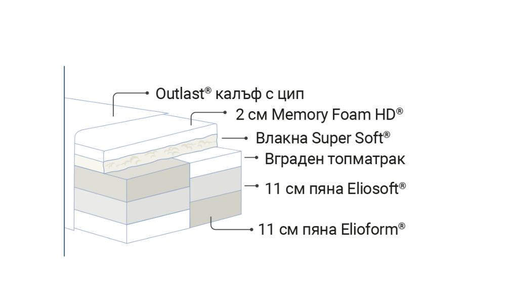 Текстилът с технология Outlast® в Armonia Dual регулира температурата на тялото по време на сън, благодарение на милиони восъчни микробалончета. При контакт с него те отнемат или отдават топлина, за да поддържат температурата му равномерна. Това предотвратява изпотяването и контролира температурните разлики.