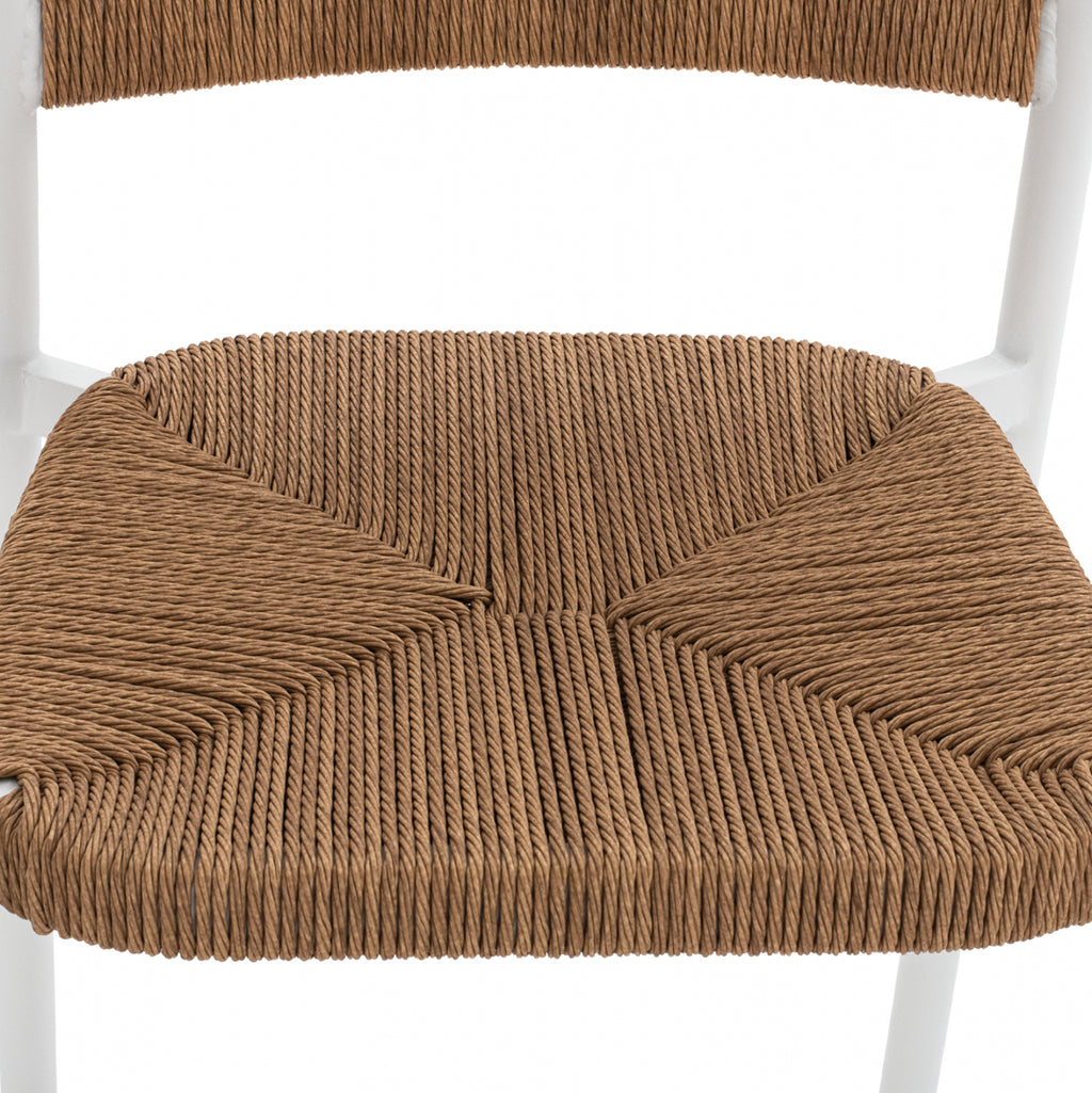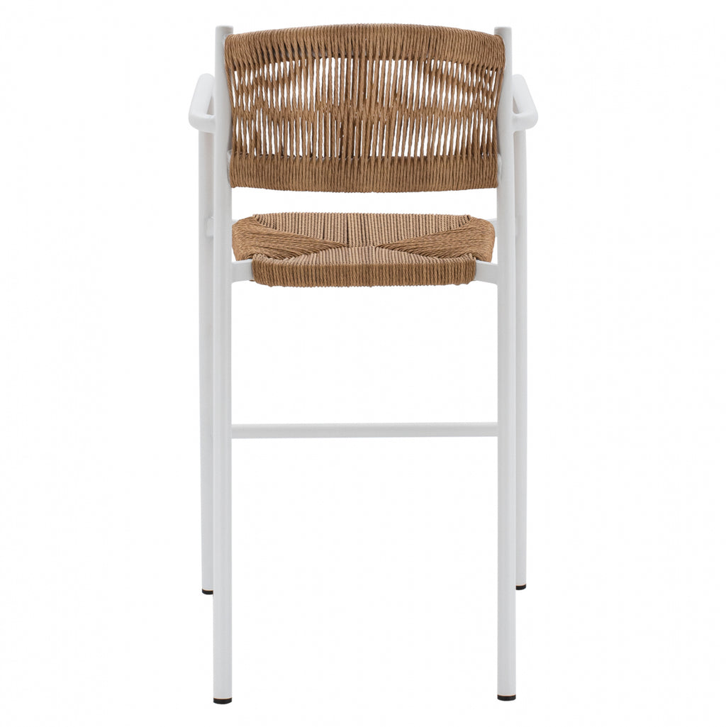Модерен бар стол, изработен от бяла алуминиева конструкция, облечена с въже на облегалката и бежова седалка. Табуретка с отлично качество и конструкция с ръчно изработена плетка на седалката. Идеален за кетъринг зони, но и за вашия дом, той ще придаде модерен и специален ефект на вашето пространство. Размери: 56х59х107см. Размери на седалката: 43,5х43 см. Височина на седалката: 69 см. Размери на ръката: 36х25 см. Височина на ръцете: 93 см. Размери на гърба: 46х27-39см. Разстояние между краката: 55х58 см. Височина на крака: 65 см. Технически характеристики Алуминиева рамка Тръба на крака Φ 28x1.5 mm. Седалкова тръба 30x18x1.2mm. Седалка и облегалка с ръчно изработена оплетка от PE въже Φ5 mm.