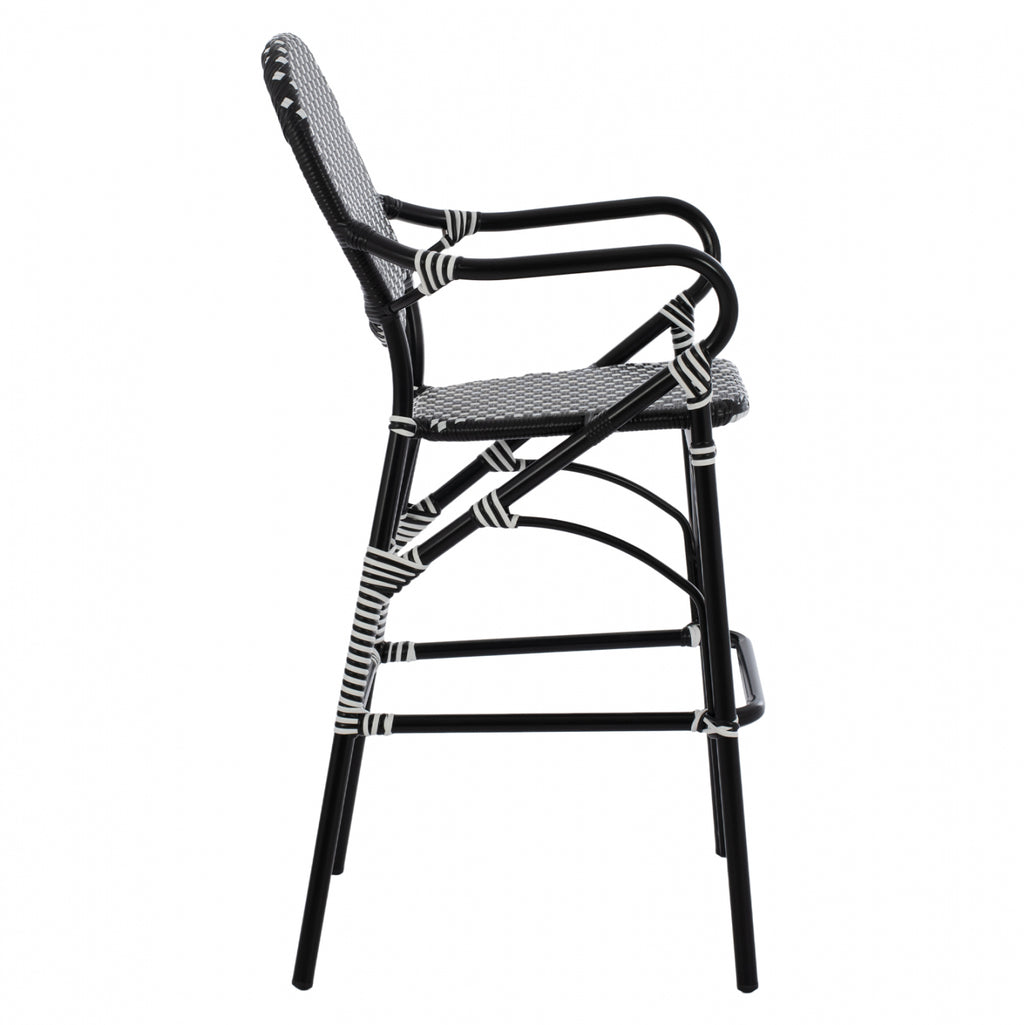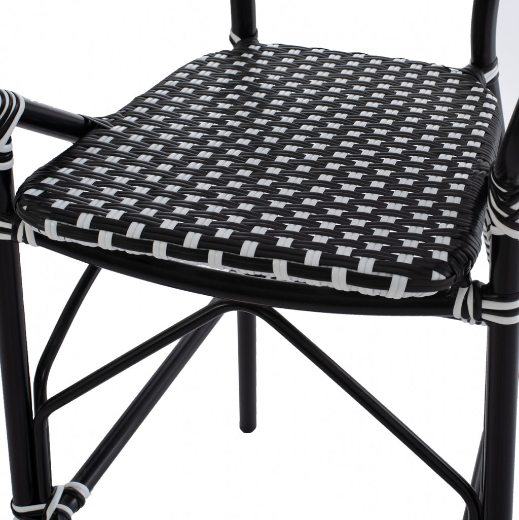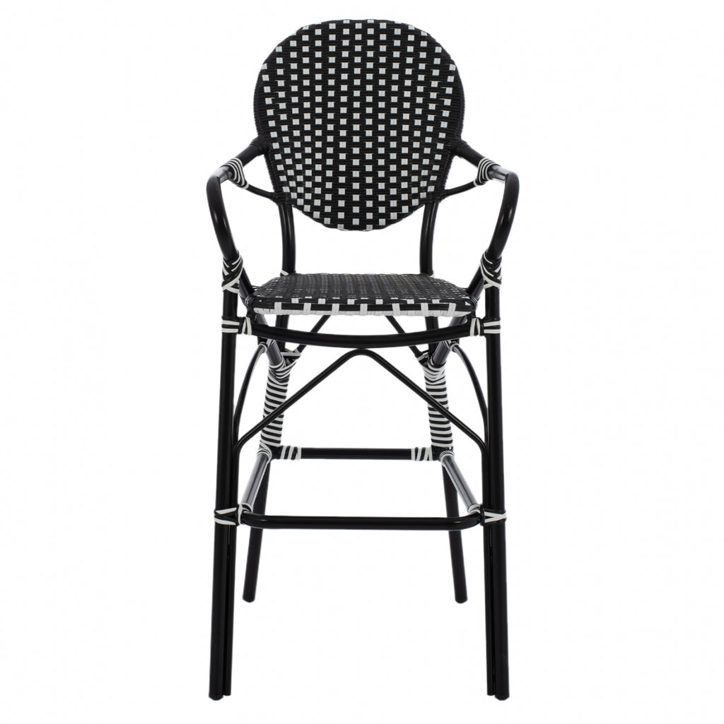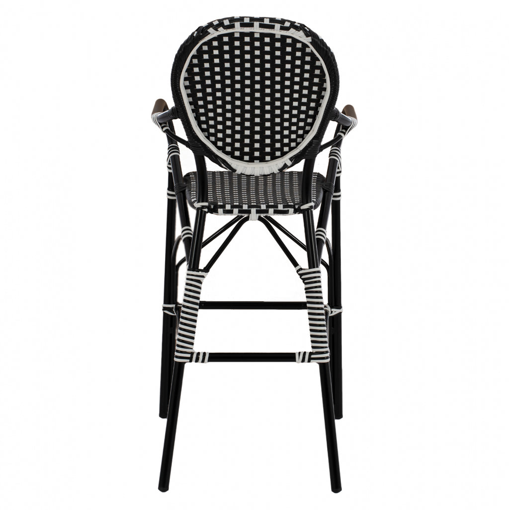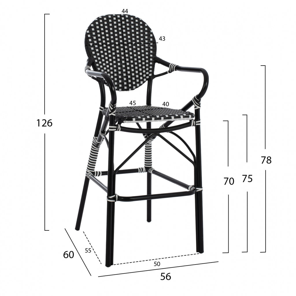 Алуминиева табуретка Bamboo Look, покрита с ракита на облегалката и седалката, в уникален нюанс на черно и бяло. Идеален за външни пространства, тъй като има голяма устойчивост на слънце и дъжд. Изработена е от алуминиева рамка в черен нюанс. Размери: 56х60х126см. Размери на седалката: 40х45 см. Размери на гърба: 43х44 см. Височина на седалката: 75см. Височина на ръцете: 78 см. Височина на крака: 70 см. Разстояние между краката: 50х55 см. Ратанът е изключително устойчив на високи и ниски температури от (-85c до +85c.), обогатен е и с UV стабилизатор за слънчевите лъчи. Ратанът е устойчив на киселини и зехтин. Технически характеристики Алуминиева рамка Размер на тръбата: D28x1.5 мм. Седалка и облегалка с ръчно изработен ратан.