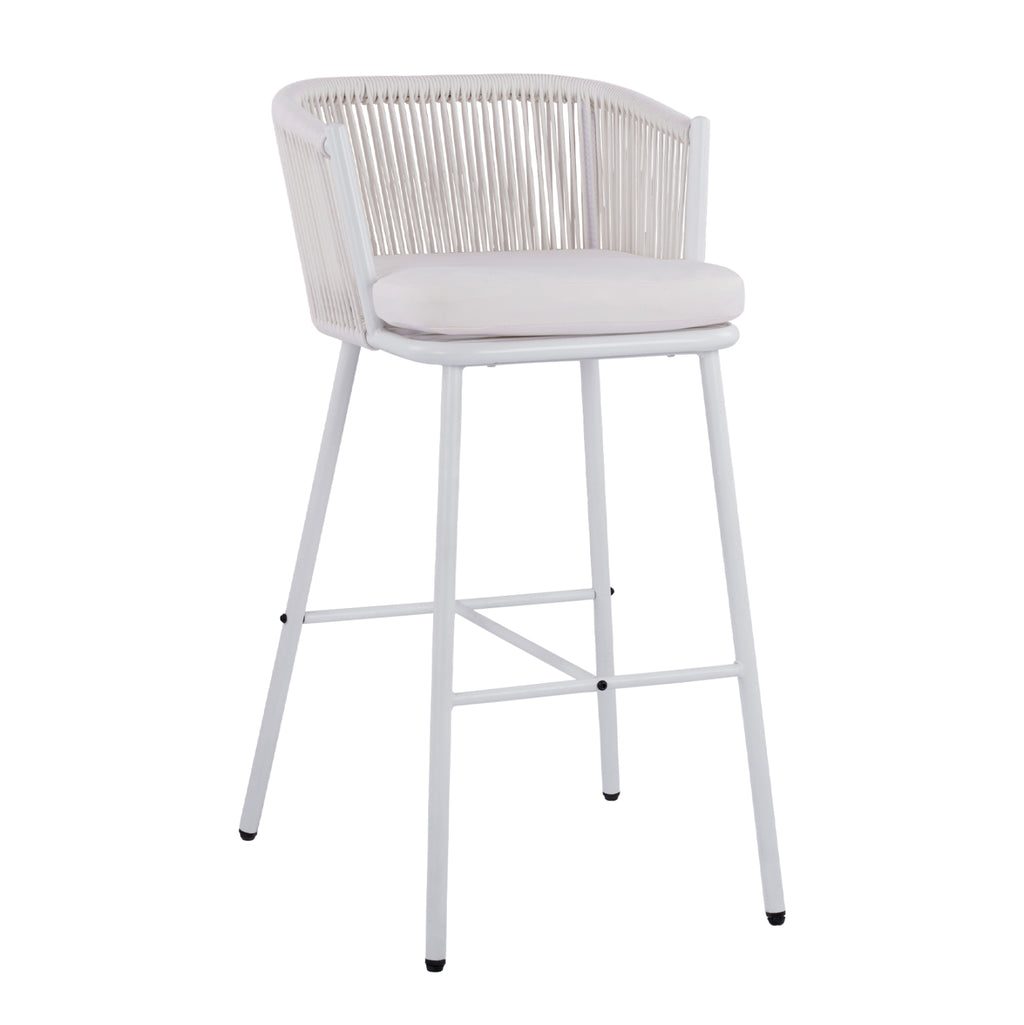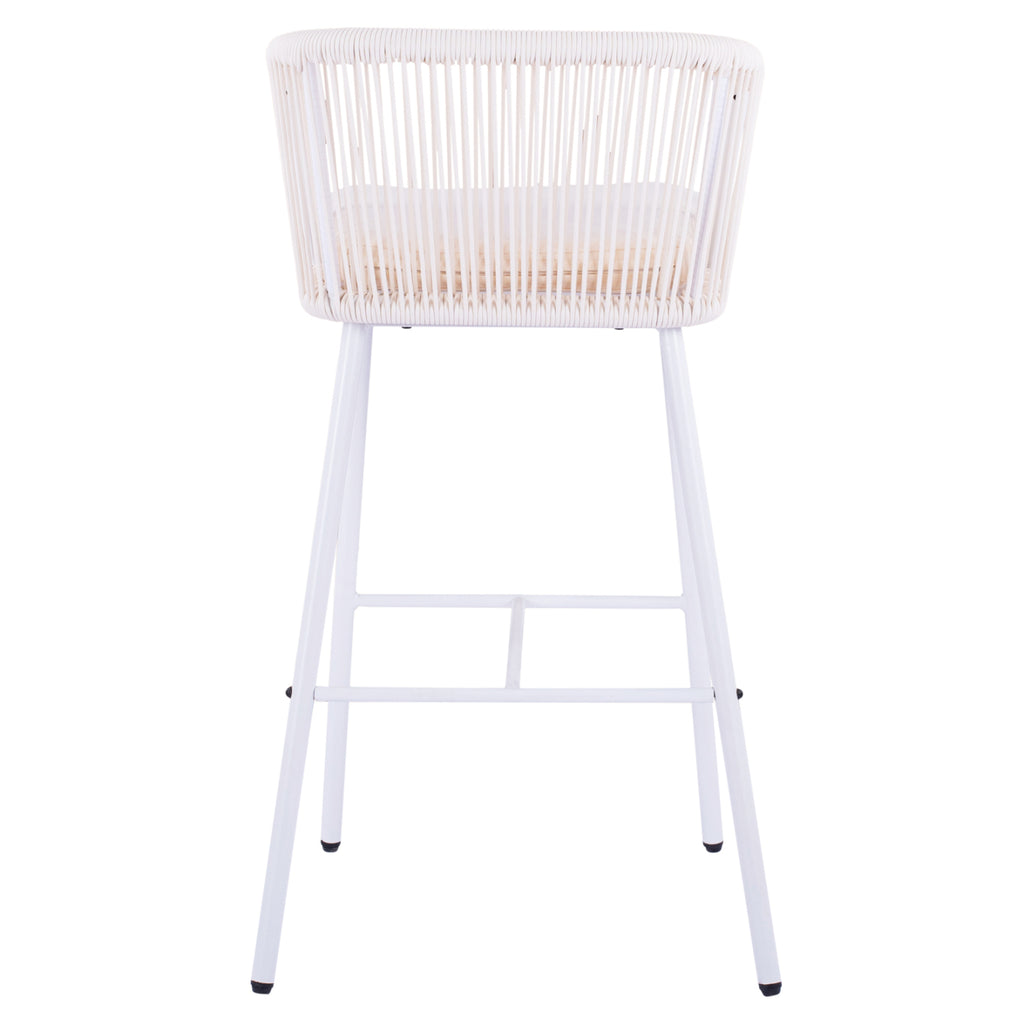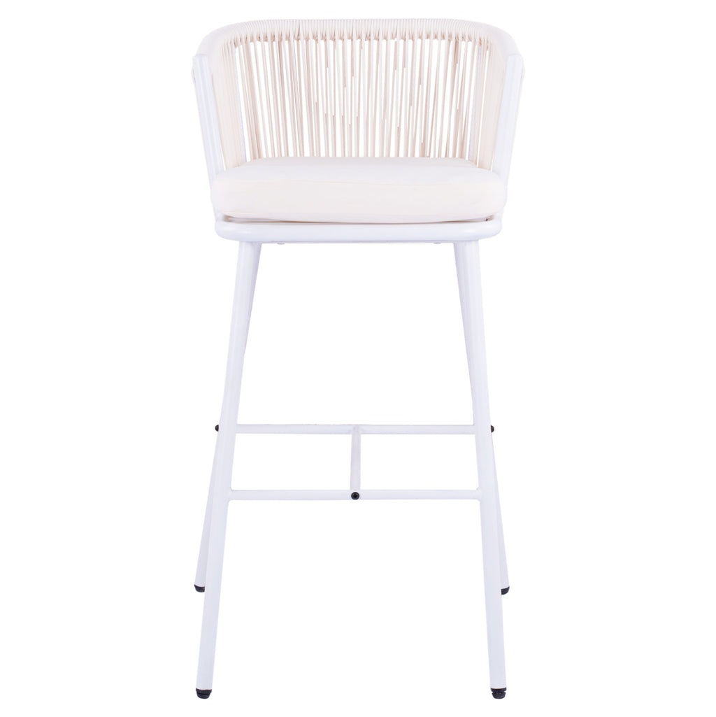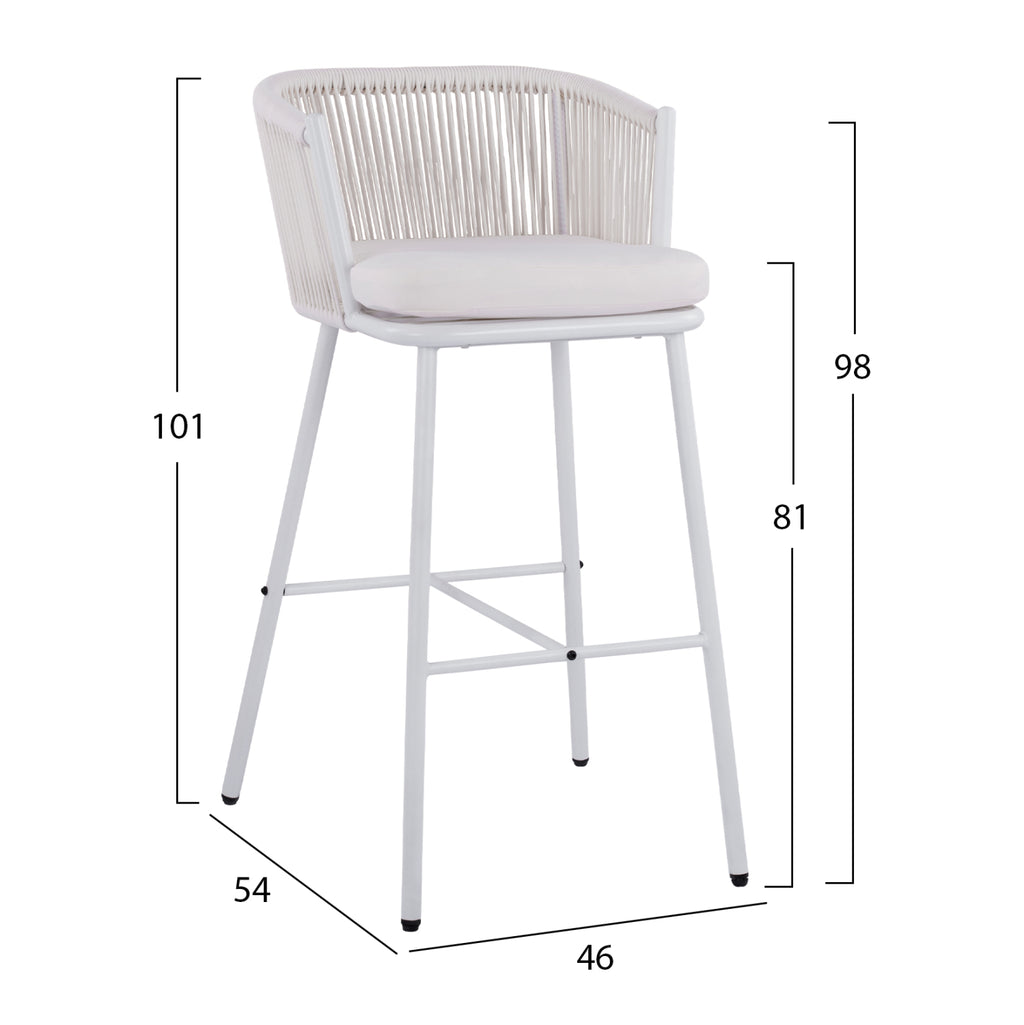 Модерна табуретка с облегалка и възглавница, външна и вътрешна, изработена от метална конструкция в бял нюанс, покрита с плетено въже в бял нюанс. Идеален за заведения за обществено хранене, но и за вашия дом, той ще ви даде красив и модерен резултат. Размери: 46х54х101см. Височина на седалката: 81 см. Височина на ръцете: 98см. Размери на седалката: 43х41 см. Дебелина на възглавницата: 6см.