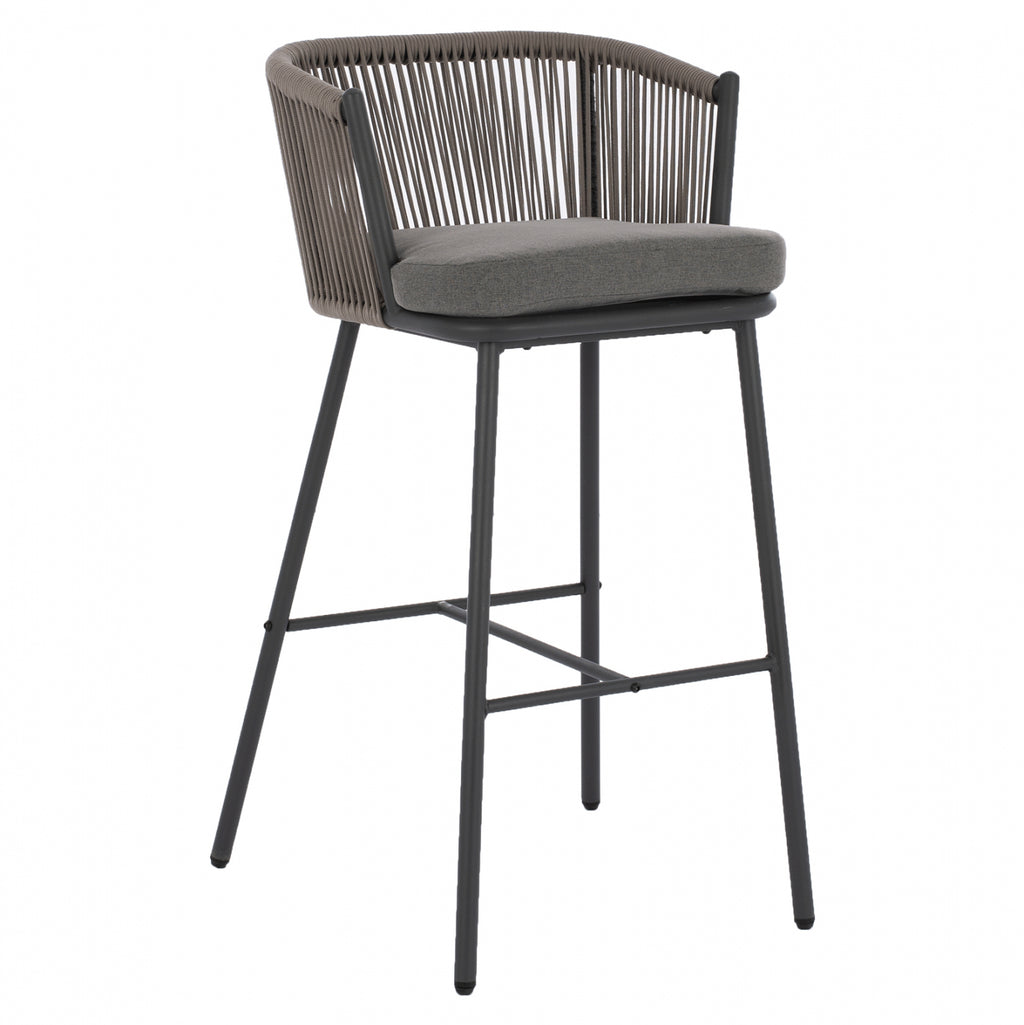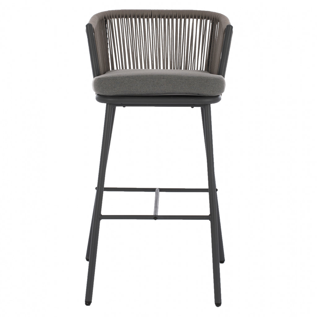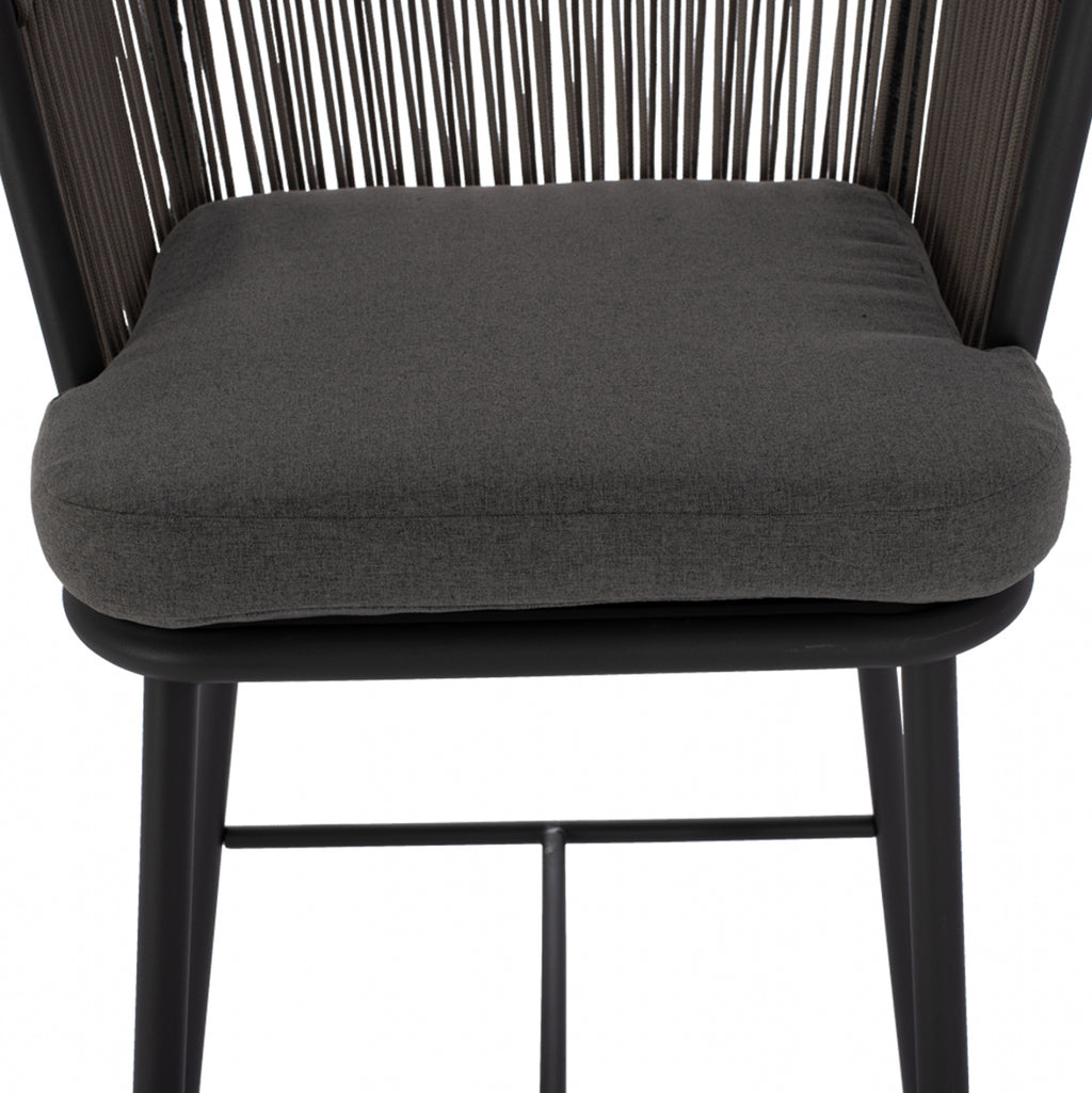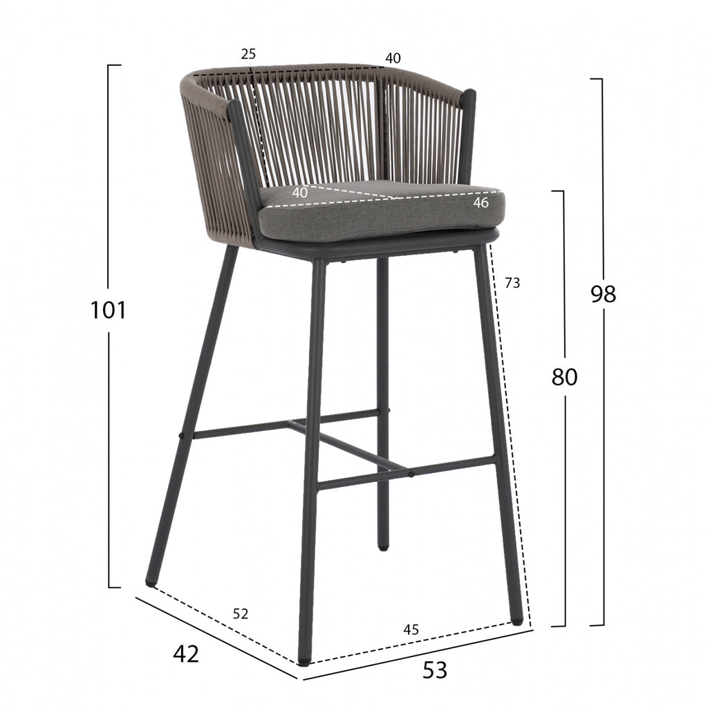 Модерна табуретка с облегалка и възглавница, както външна, така и вътрешна, изработена от метална конструкция в сив нюанс, покрита с плетено въже в също сив нюанс. Идеален за заведения за обществено хранене, но и за вашия дом, той ще ви даде красив и модерен резултат. Размери: 53х42х101см. Размери на седалката: 46х40 см. Размер на гърба: 40х25 см. Височина на седалката: 80см. Височина на крака: 73 см. Височина на ръцете: 98см. Разстояние между краката: 45х52 см. Дебелина на възглавницата: 7 см.