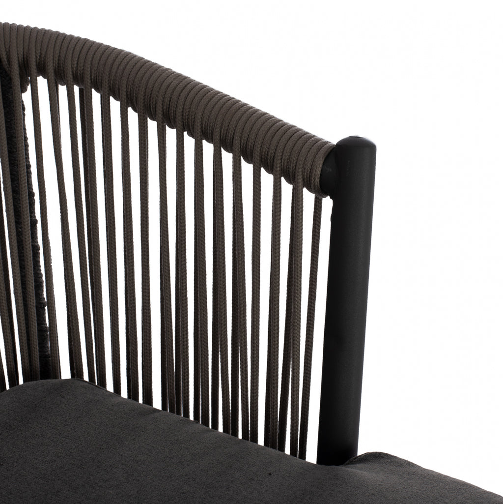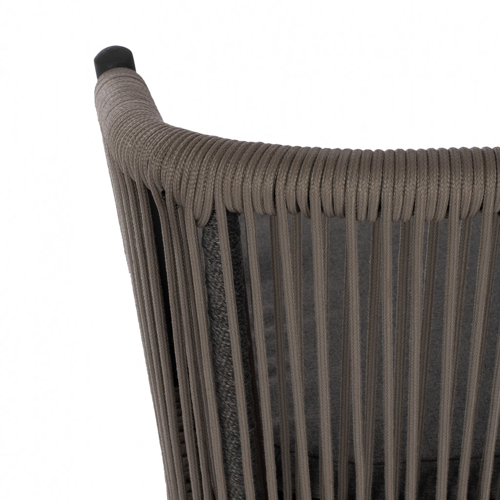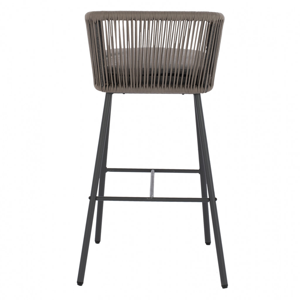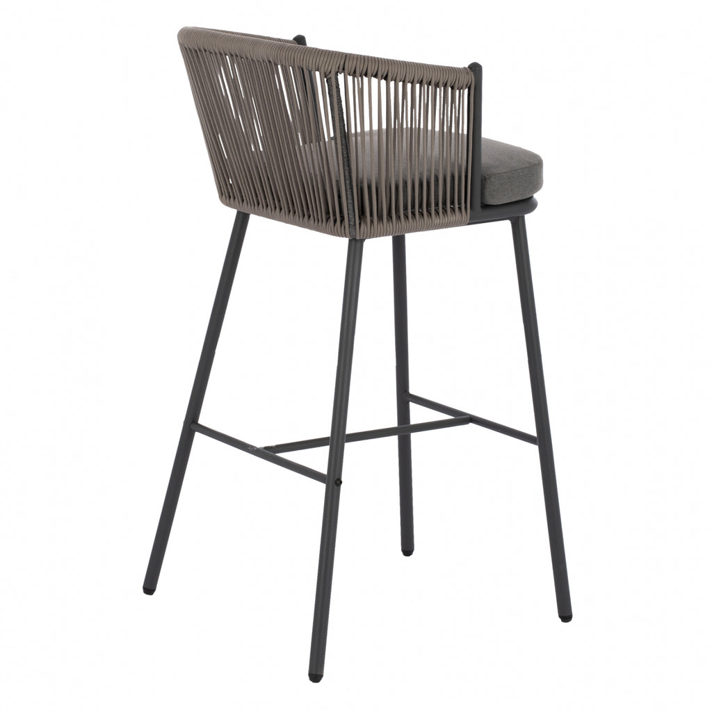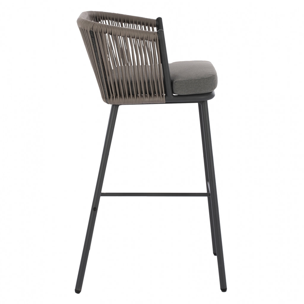 Модерна табуретка с облегалка и възглавница, както външна, така и вътрешна, изработена от метална конструкция в сив нюанс, покрита с плетено въже в също сив нюанс. Идеален за заведения за обществено хранене, но и за вашия дом, той ще ви даде красив и модерен резултат. Размери: 53х42х101см. Размери на седалката: 46х40 см. Размер на гърба: 40х25 см. Височина на седалката: 80см. Височина на крака: 73 см. Височина на ръцете: 98см. Разстояние между краката: 45х52 см. Дебелина на възглавницата: 7 см.