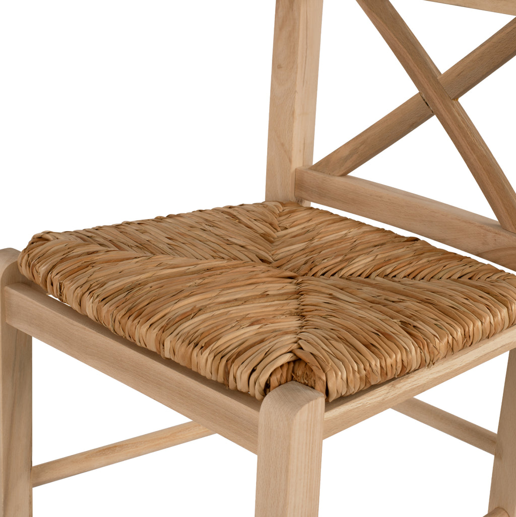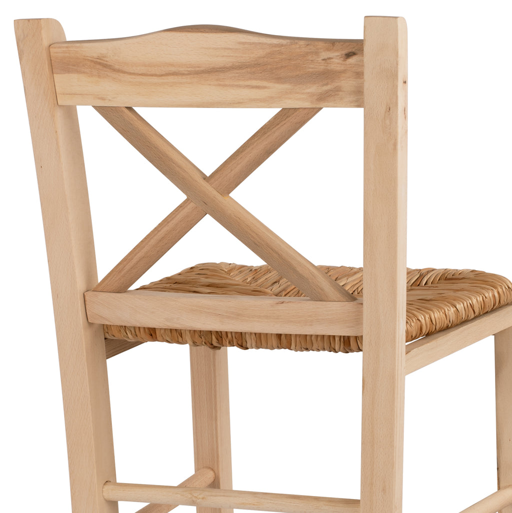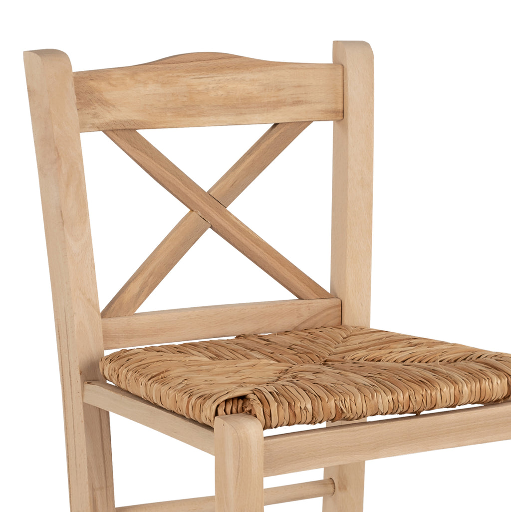 Масивната букова дървесина е известна с изключителната си здравина и красива текстура. Небоядисаната повърхност запазва естествения цвят и характер на дървото, докато рогозката добавя автентичност и комфорт. Всеки стол е уникален с неповторимата си дървесна текстура.
