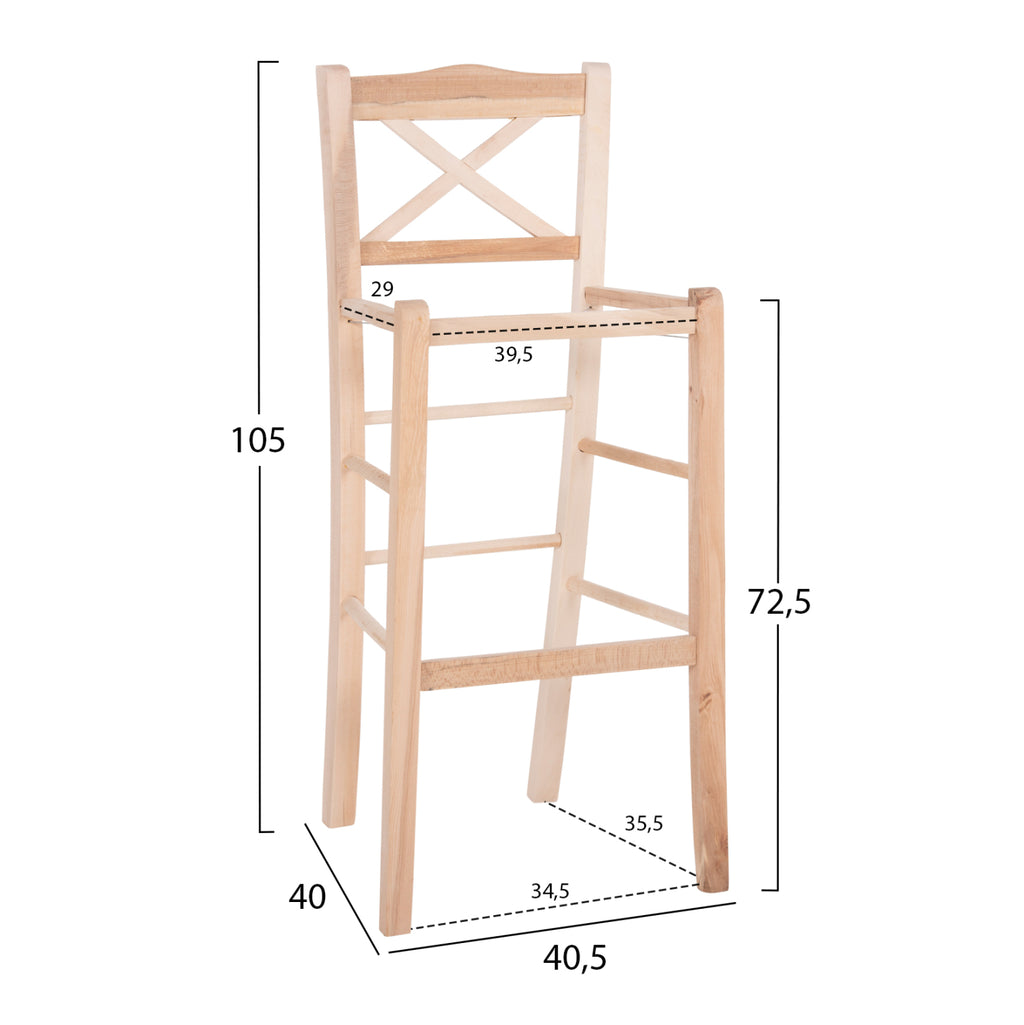 Табуретката LUCIUS за професионална употреба е красива мебел от букова дървесина и се доставя НЕНАЛИЧНА. Гърбът е с кръстосано оформление и е естетически подходящ за помещения, декорирани в класически гръцки традиционен стил и не само. Доставя се само рамката, която е вързана с тел за по-голяма здравина и издръжливост във времето. РАЗМЕРИ: 40.5x40x105H см. Размери на седалката: 39,5х29 см. Размери на гърба: 40х34см. Височина на седалката: 72,5 см. Височина на крака: 69 см. Разстояние между краката: 34,5-40х35,5-42 см. Височина на крака отзад: 28-34,5 см. КОНСТРУКТИВНИ МАТЕРИАЛИ: Рамката е изработена от качествена масивна БУКОВА дървесина. Масивното дърво е вид дърво, чисто и неизбелено, традиционно използвано от дърводелците за направата на мебели. Масивната дървесина е най-скъпият избор по отношение на дървесината, но се откроява със своята вечна естетика. Ефектът, който предлага на притежателя си е наистина уникален. Букът е твърдо, здраво, еластично и тежко дърво с малки пори. Това дърво е елегантно и има червеникавокафяв цвят. Когато е сух, букът се счита за по-добър от дъба по отношение на якост на огъване, твърдост и устойчивост на удар и разкъсване. Лесно приема консерванти и залепва ефективно. Това е най-широко използваната дървесина в мебелната индустрия. Импрегнирането в най-широк смисъл е оцветяване на дърво (обикновено лакове) по метода на потапяне. В резултат на това дървото има многократно по-дълъг живот от необработеното дърво. ПОДДРЪЖКА: Необходимо е само почистване от прах и при необходимост почистване с влажна кърпа. ** Цветопредаването на продукта може леко да се различава от неговото фотографско представяне на вашия екран.
