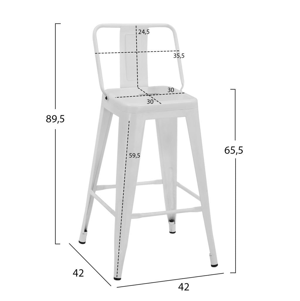 МЕЛИТА Средновисок метален стол с облегалка в бял матов нюанс. В модерен ИНДУСТРИАЛЕН метален дизайн, който е най-новата пазарна тенденция. Подходящ и за професионална употреба със специална издръжливост. Размери: 42x42x89.5H см. Височина на седалката: 65,5 см. Размери на седалката: 30х30 см. Размер на гърба: 35.5x24.5H cm. Височина на крака: 59,5 см.