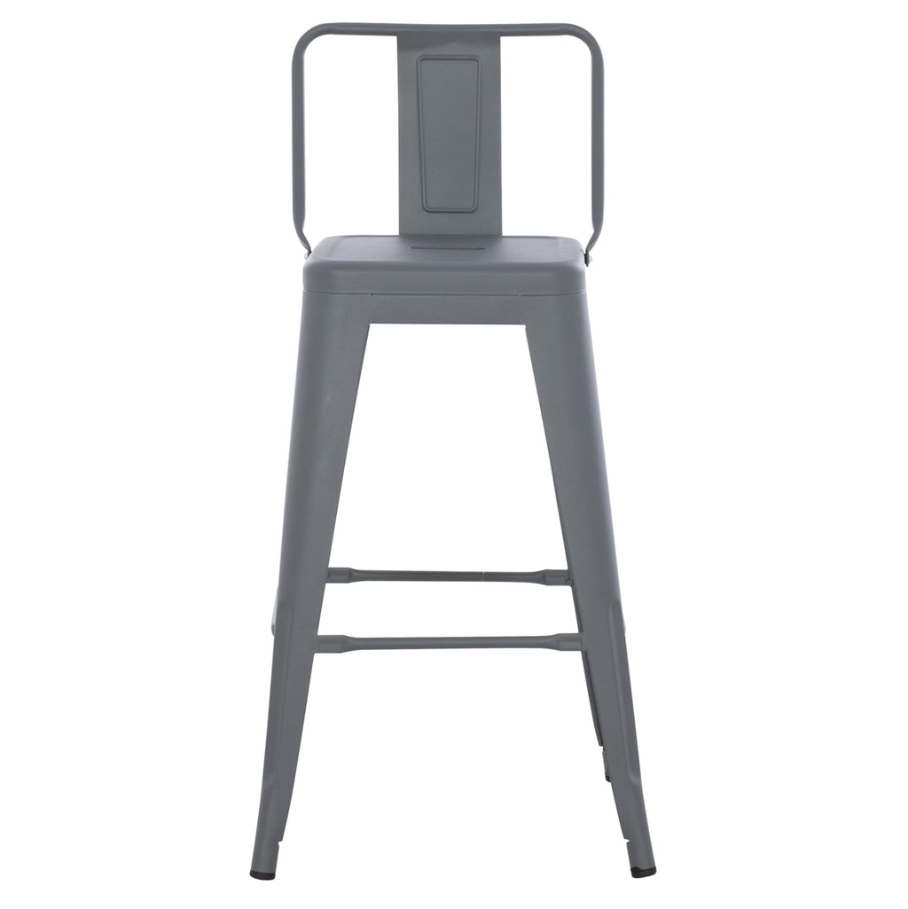 Бар стол Мелита с облегалка, средновисок, в сив нюанс 42x42x98 см. Модерен бар стол в индустриален дизайн, който може да стои хармонично във всяка част от вашия дом или бизнес. Неговият дизайн, съчетан с високото качество на изработка и издръжливост, го правят необходим за оборудването на всяко пространство. Изработен от изключително издръжлива метална рамка. Има и поставка за крачета за опора на краката. Краищата на опорните крака имат пластмасови капаци за защита на пода от нежелана повреда. Размери: 42х42х98см. Размери на седалката: 30х30 см. Размер на гърба: 36х25см. Височина на седалката: 67 см. Разстояние между краката: 37х37 см. Предлага се в разглобен вид в опаковка.