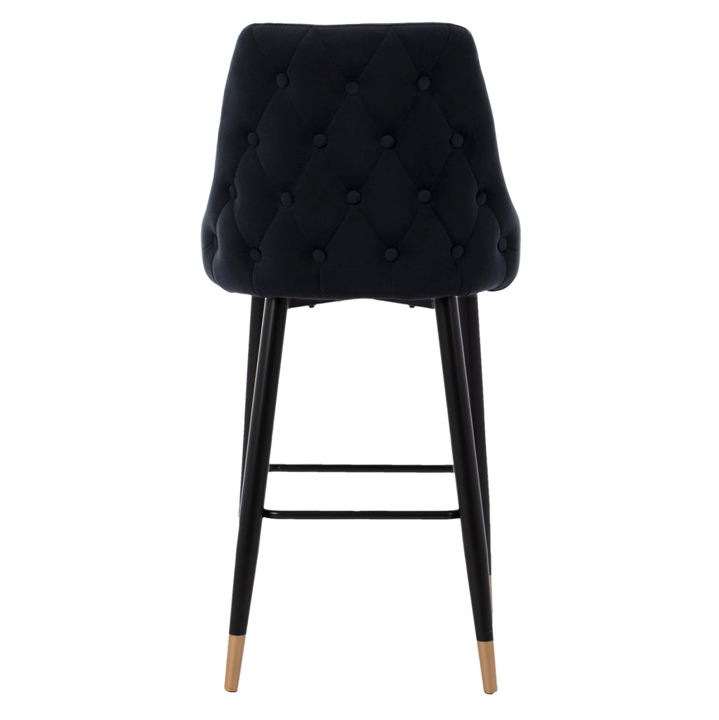 Табуретка SERENITY е тапицирана с кадифена материя в черно с метална рамка в матово черно и златни детайли. Облегалката на табуретката е тапицирана с прекрасен капитонажен дизайн. Изберете модерни табуретки, които придават на вашето пространство различен щрих. Нотка елегантност, съчетана с безброй цветови вариации и форми. Леко лъскавата материя с неповторимия си вид и усещане не е без причина една от най-добрите тенденции в живота. Кадифената табуретка е разликата! Размери: 53x48x110 см. Размери на седалката: 46x44 см. Размери на облегалката: 38x38 см. Височина на седалката: 76 см. Височина на краката: 67 см. Разстояние между краката: 43x43 см.