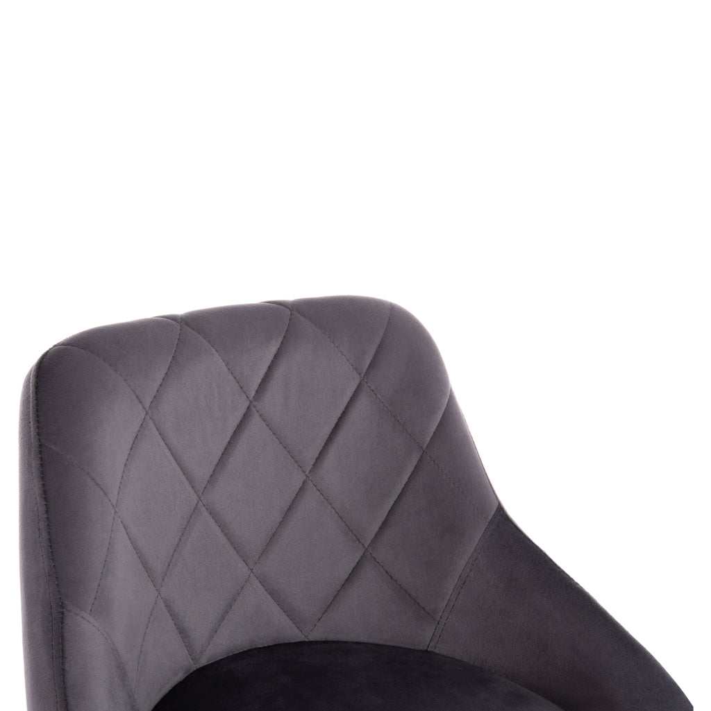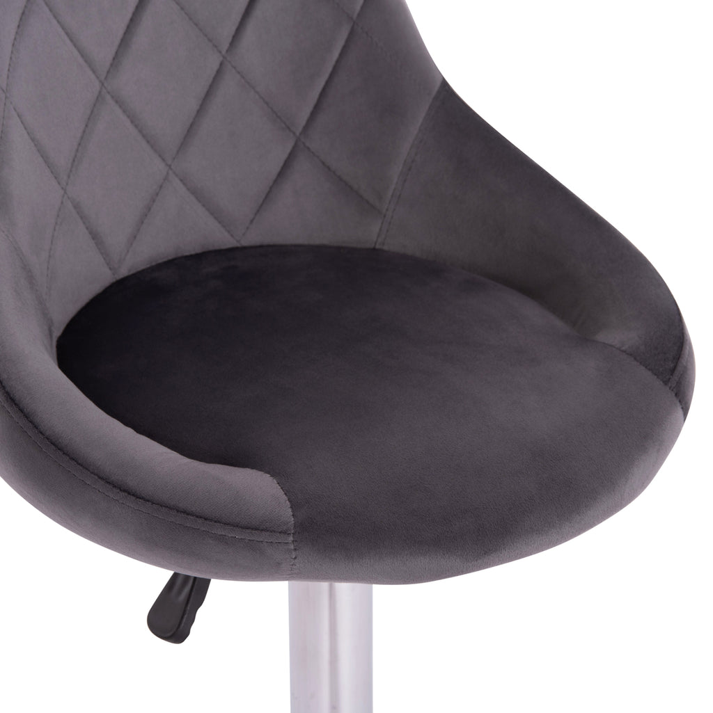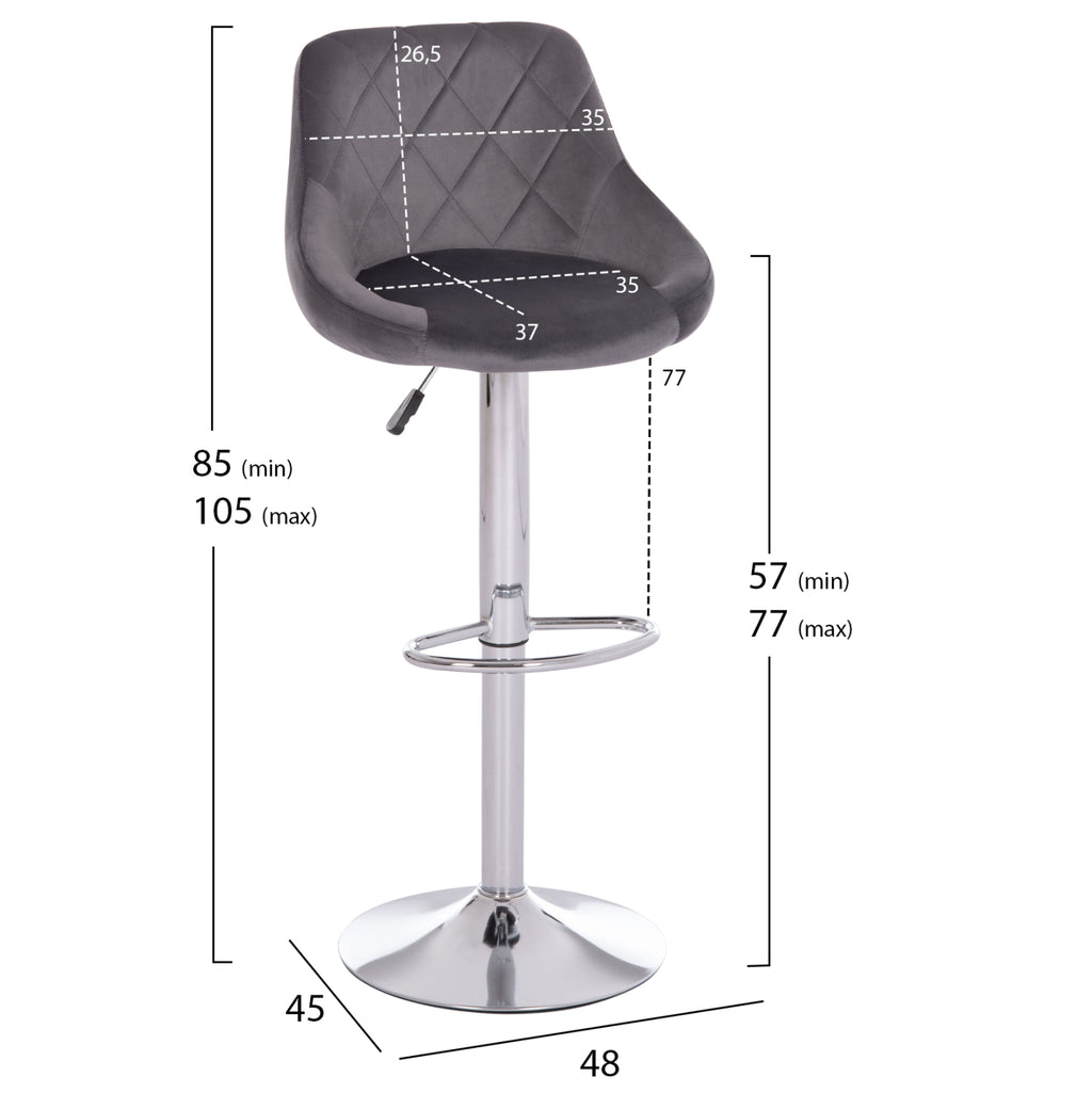 Запознайте се с ROSE. СИВ кадифен бар стол, който има всичко, което бихте могли да пожелаете от подобна мебел. ROSE е семпъл, наистина висококачествен и елегантен на външен вид и определено привлича вниманието. Той е въртящ се, висок с облегалка, а облегалката е с капитониран стил, което подсилва специалния характер на този стол. Но хубавите неща не спират дотук! Хромираната метална колона на стола е с полукръгла поставка за крака, като завършва с красива широка тава, която осигурява опора и баланс. Специалната характеристика е наличието на амортисьори за регулиране на височината на седалката, което се извършва с елегантен лост под седалката. РАЗМЕРИ