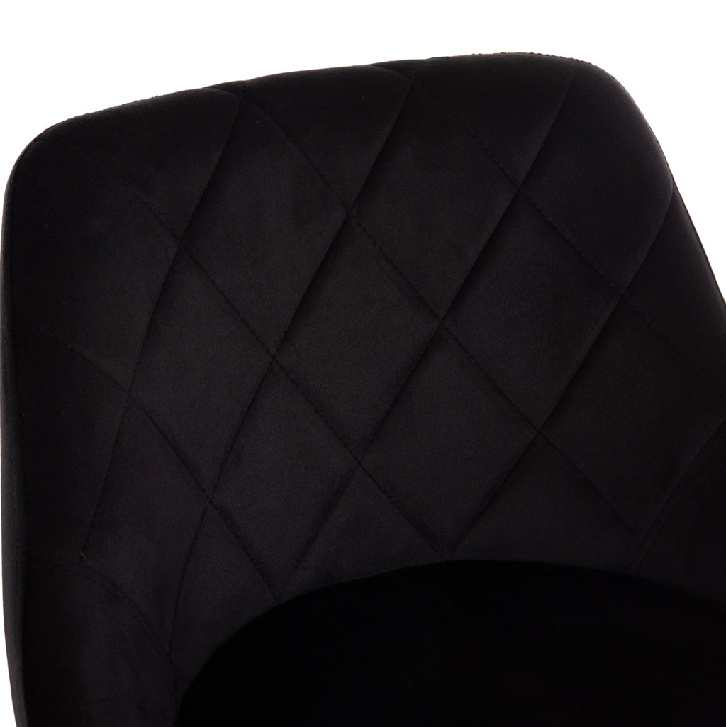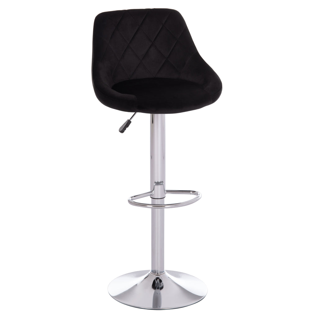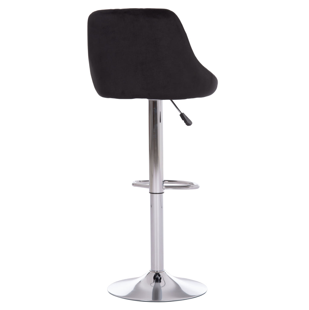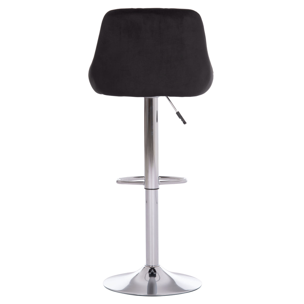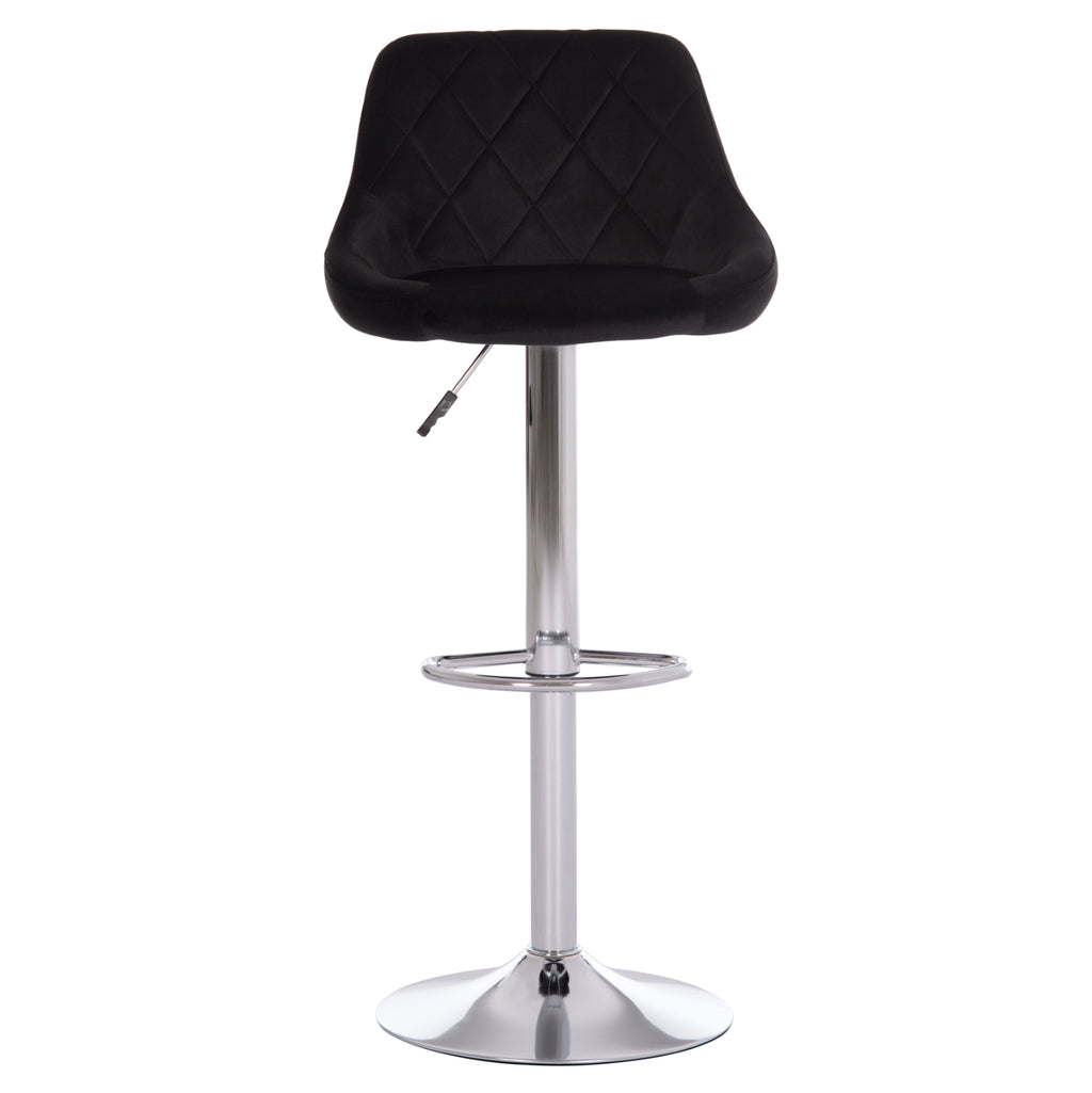 Запознайте се с ROSE. ЧЕРЕН кадифен бар стол, който има всичко, което бихте могли да пожелаете от подобна мебел. ROSE е семпъл, наистина висококачествен и елегантен на външен вид и определено привлича вниманието. Той е въртящ се, висок с облегалка, а облегалката е с капитониран стил, което подсилва специалния характер на този стол. Но хубавите неща не спират дотук! Хромираната метална колона на стола разполага и с полукръгла поставка за крака, като завършва с красива широка тава, която осигурява опора и баланс. Специалната характеристика е наличието на амортисьори за регулиране на височината на седалката, което се извършва с елегантен лост под седалката. РАЗМЕРИ