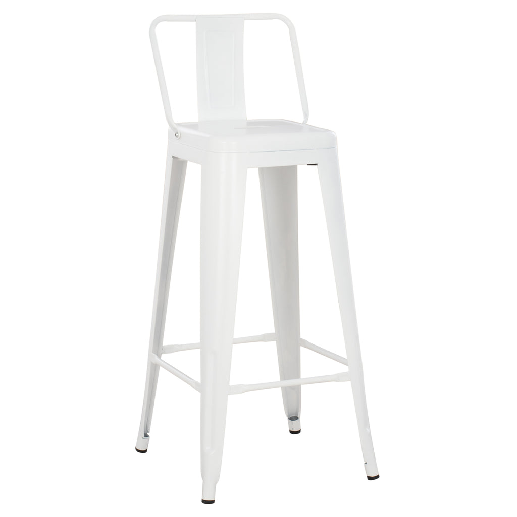 Бар стол Melita с облегалка в бял матов нюанс 43X43X100см. Модерен бар стол в индустриален дизайн, който може да стои хармонично във всяка част от вашия дом или бизнес. Неговият дизайн, съчетан с високото качество на изработка и издръжливост, го правят необходим за оборудването на всяко пространство. Изработен от изключително издръжлива метална рамка. Има и поставка за крачета за опора на краката. Краищата на опорните крака имат пластмасови капаци за защита на пода от нежелана повреда. Размери: 43х43х100см. Размери на седалката: 30х30 см. Размер на гърба: 36х25см. Височина на седалката: 77 см. Разстояние между краката: 37х37 см. Предлага се в разглобен вид в опаковка.