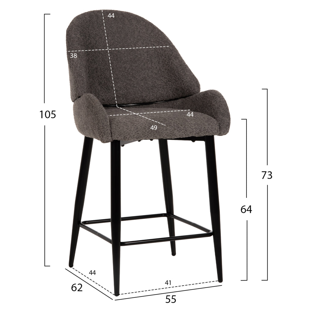 КГ8586.01- -Професионален бар стол в СИВ цвят с ЧЕРНИ метални крака. Краката са съединени около средата с метална релса. Табуретката е семпла, качествена и елегантна на външен вид и със сигурност ще привлече вниманието с дамаската букле, която е тапицирана. То е високо с облегалка, която прегръща тялото, докато седалката има повдигнати страни, което подчертава специалния характер на тази табуретка. ТЕХНИЧЕСКИ ХАРАКТЕРИСТИКИ: Общи размери: 55x62x105Y см. Височина на седалката: 64 см. Височина на ръцете: 73см. Размери на седалката: 44х49 см. Размери на гърба: 38х44см. Разстояние между краката: 41х44 см. Височина на постамента: 20см. МАТЕРИАЛ НА ИЗРАБОТКА: Краката са метални с електростатична боя. Електростатичното боядисване е процес на сухо покритие, използван като метално покритие. Електростатичното боядисване е нанасяне на сух прах чрез електростатичен процес, който след това се „свързва“ към метала чрез топлина. Подходящ е както за вътрешни, така и за външни приложения. Тапицерията на табуретката е изцяло с дамаска BOUCLÉ . Всяка тъкан, която има извиване на възел, се нарича букле. Изработено е от почти всички суровини (въпреки че обикновено е синтетично) със специални възли или силно усукани конци, така че да има къдрава повърхност. Не се мачка и може да бъде изчистена, меланжирана, карирана или туид. ПОДДРЪЖКА: Платът от букле можете да избършете с прахосмукачка, а при петна използвайте леко влажна кърпа. ПРЕДИМСТВА: •Стабилна конструкция •Широка и удобна седалка •Крака •Специален външен вид с дамаска букле **Табуретката се доставя разглобена във фабрична опаковка