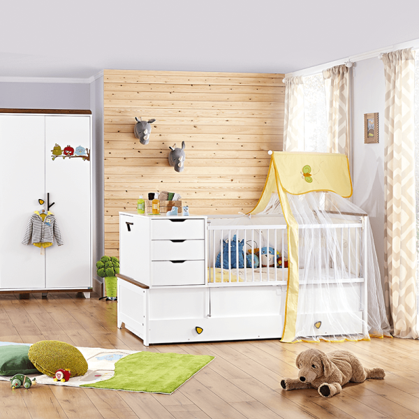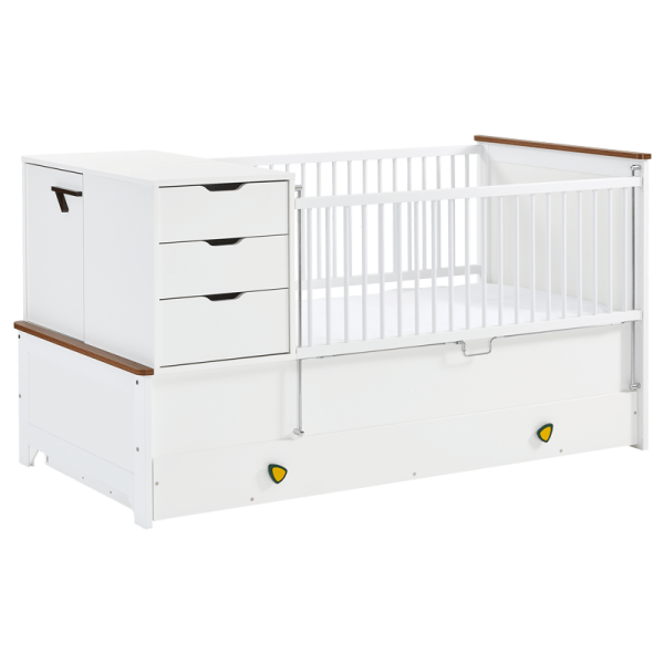 Бебешка кошара и детско легло 2 в 1 KAKULE съчетава функционалност и стил в едно иновативно решение за растящото дете. Горната част на конструкцията включва удобен модул с три чекмеджета и шкаф с рафт – идеални за подреждане на дрешки, пелени и аксесоари. В основата е разположено още едно, по-голямо чекмедже на колелца, което осигурява допълнително място за съхранение и лесен достъп. Когато детето порасне, страничните прегради и горният шкаф се премахват и леглото се трансформира в стандартно детско легло – едно дългосрочно решение, което расте заедно с вашето дете. Моделът е подходящ за матрак с размери 80 x 180 см. Дизайнът е семпъл и елегантен, с акценти от дървесен цвят и свежо бяло, които се вписват във всяка детска стая.