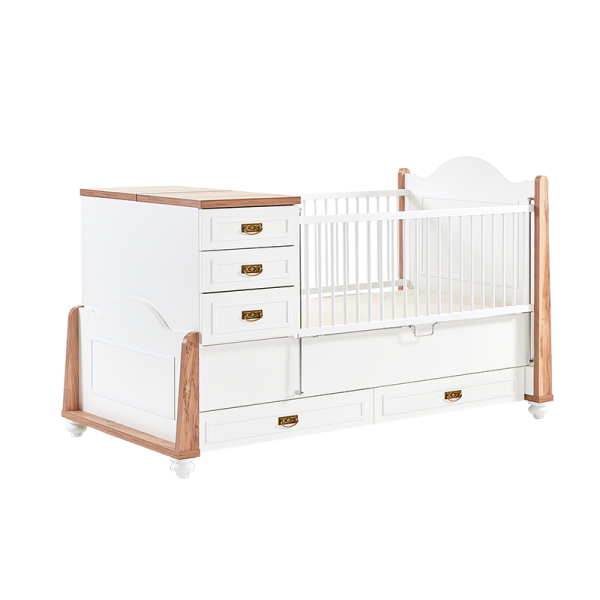 Бебешка кошара и детско легло 2в1 TIFFANY 80 x 180 е елегантно и практично решение, което расте заедно с вашето дете. Със своята класическа визия и детайлна изработка, моделът предлага сигурност, стил и адаптивност – всичко, което очаквате от първата детска стая. Системата за растящо легло позволява трансформация на основната конструкция във възрастово легло, ракла и нощно шкафче, които могат да се използват самостоятелно. Височината на предпазната преграда се регулира лесно чрез удобен механизъм с щракване. Леглото е изработено от висококачествени плоскости с дебелина 18–25 мм и издържа натоварване до 130 кг. Чекмеджетата са с плавно затваряне, изработени от 18 и 8 мм плоскости, с товароносимост до 25 кг. Чекмеджето на колелца се отваря в една посока и предлага просторно място за съхранение на спално бельо и принадлежности. Месинговите дръжки добавят ретро акцент и са едновременно стилни и издръжливи. Краката с височина 8 см от ABS материал позволяват лесно почистване с робот-прахосмукачка. Цената не включва матрак и аксесоари – те се предлагат отделно.