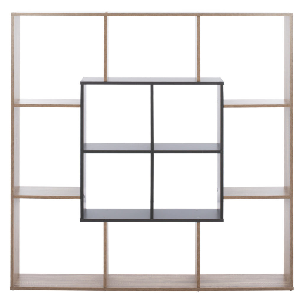 Етажерка за книги в сонама-сив нюанс 136X22X136см. Ергономично предложение, за да поддържате вашите книги или дребни предмети подредени в стилна композиция. Библиотеката ви дава неограничени възможности за организиране и съхранение, включваща осем рафта по периметъра за отворено организиране на вашите предмети, както и четири рафта в центъра за декориране и излагане на любими книги и аксесоари. Изработен от висококачествен меламин, устойчив на износване и време. Размери: 136х22х136см. Размери на рафта Ax2: 32-43x22x32-43 см. Размери на рафта Bx2: 43x22x32 см. Размери на рафта Γx4: 32x22x32 см. Размери на рафта Δx2: 32x22x43 см. Продуктът се предлага разглобен в опаковка.