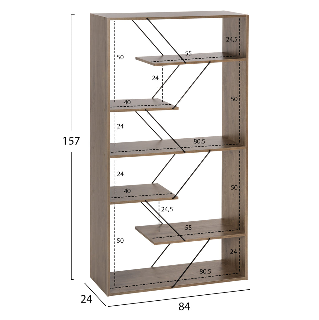 Етажерка TARS е модерно предложение за вашия офис или навсякъде другаде, където искате да поставите библиотека. Разполага с 5 монтажни рафта, които не заемат цялата дължина на библиотеката, но се поддържат от метални пръти заедно с рафт, който е долната повърхност на библиотеката, а размерите му я правят удобна за много пространства. Цветът му е МАСЛИНЕНО СИВ с ЧЕРНИ ленти. РАЗМЕРИ: 84x24x157H см. Размери на рафт А: 55x24x24.5H см. Размери на рафт B: 40x24x24-50H см. Размери на рафт C: 80.5x24x24-50H см. Размери на рафта D: 40x24x24-50H cm. Размери на рафта E: 55x24x24.5H cm. Размери на рафта Z: 80.5x24x24-50H cm. МАТЕРИАЛИ НА ИЗРАБОТКАТА: Цялата библиотека е изработена от висококачествен меламин с дебелина 15 мм. Меламинът е вид дървесина под формата на ПДЧ. ПДЧ са продукти, които имат формата на плоча (панел). Като материал е много издръжлив и с голяма твърдост. Така че това е синтетичен материал с много твърда повърхност, което го прави много устойчив на драскотини, абразия и петна. Металните пръти са с размер Φ6 mm и са боядисани с електростатична боя. Електростатичното боядисване е процес на сухо покритие, използван като метално покритие. Електростатичното боядисване е нанасяне на сух прах чрез електростатичен процес, който след това се „свързва“ към метала чрез топлина. ПОДДРЪЖКА: Меламинът, който е строителният материал, се почиства много лесно от петна благодарение на твърдата си повърхност. Можете да избършете всички повърхности с влажна кърпа и това е достатъчно, за да изглежда библиотеката отново като нова. За упорити петна можете да използвате мек почистващ препарат. ПРЕДИМСТВА: •Стабилна конструкция •Естетично красиви мебели с модерен дизайн •Удобни размери •Достатъчна складова площ •Готовност за доставка Продуктът се предлага разглобен във фабрична опаковка.