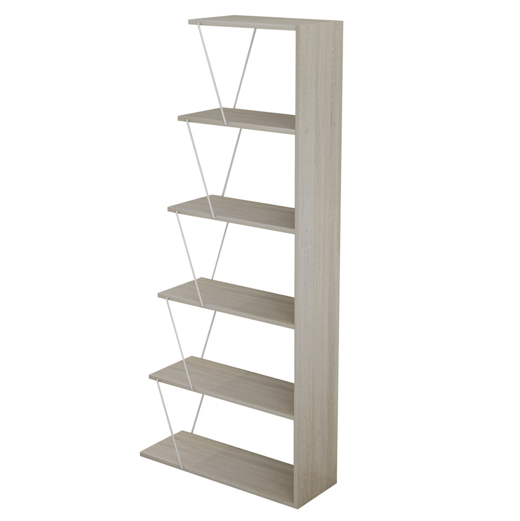 Мебелта разполага с четири стъпаловидно разположени рафта и допълнителен долен рафт за стабилност и допълнително място за съхранение. Всеки рафт е с различна дължина, което позволява интересна визуална подредба на книги, декорации, растения или снимки. Конструкцията се поддържа от здрави метални пръти с дебелина Φ6 мм, боядисани с електростатична боя, която предпазва метала от корозия и придава издръжливост и стилен завършек.