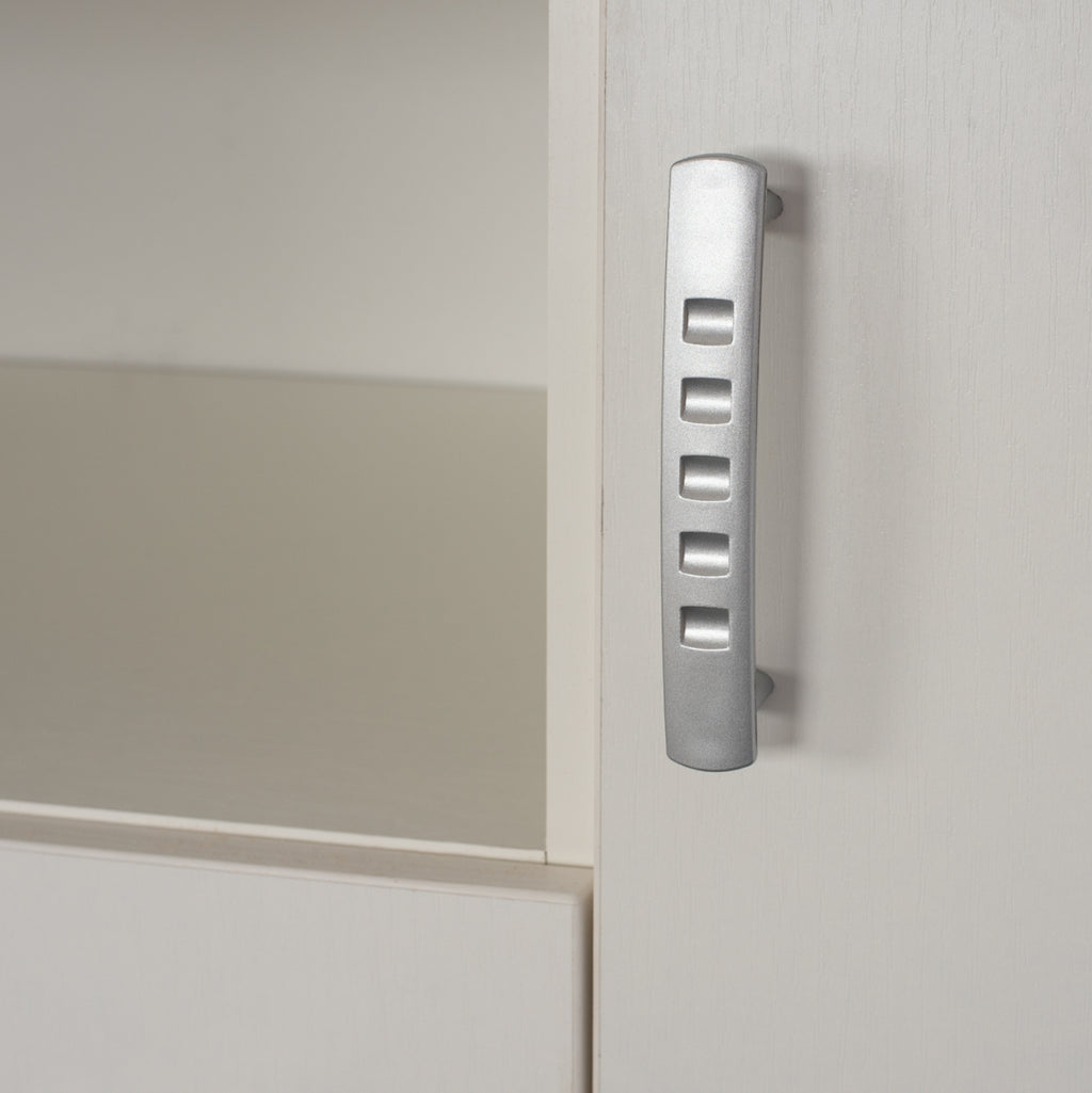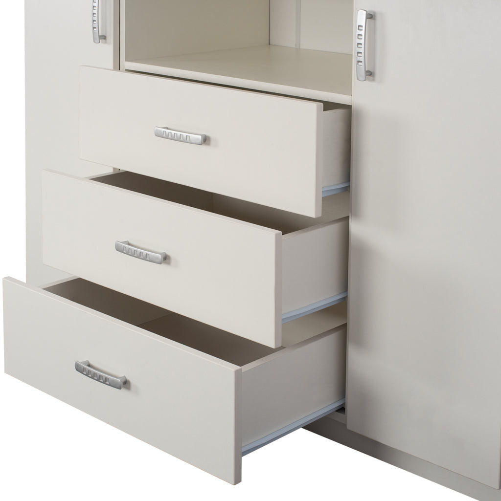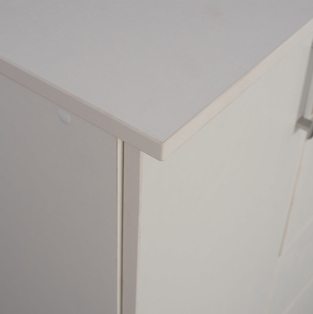 Бюфет в бял нюанс, който ще завърши естетиката на вашето пространство, като същевременно ще ви предложи допълнителни пространства за излагане и съхранение на вещи. Функционално предложение за декорация на вашия хол или всекидневна. Има три чекмеджета, два шкафа и отворена повърхност за съхранение на дребни вещи. Изработен от меламин с отлично качество, дебелина 16 мм, устойчив на износване и време. Общи размери: 120x45x85 см. Размери на шкафа: 29х40х35см. (x2) 29x40x35 см. (х2) Размери на скрина: 50х36х14см. (x3) Отворена повърхност: 56x41x19 см. Европейско производство и произход. Продуктът се предлага разглобен във фабрична опаковка.