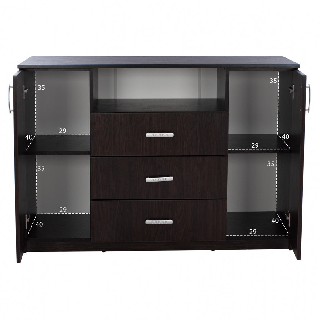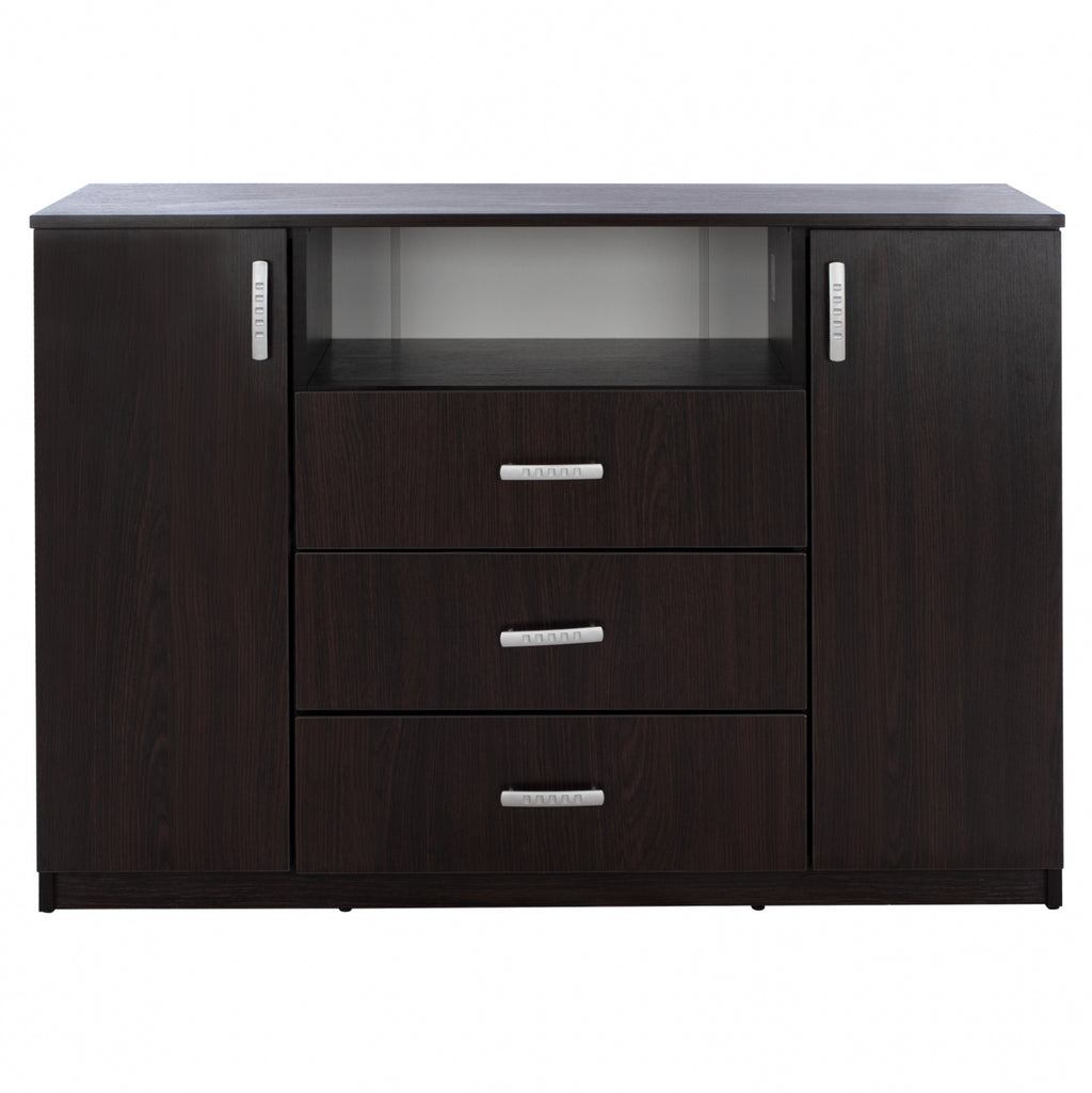 Бюфет в нюанс венге, който ще завърши естетиката на вашето пространство, като същевременно ще ви предложи допълнителни пространства за излагане и съхранение на вещи. Функционално предложение за декорация на вашия хол или всекидневна. Има три чекмеджета, два шкафа и отворена повърхност за съхранение на дребни вещи. Изработен от меламин с отлично качество, дебелина 16 мм, устойчив на износване и време. Общи размери: 120x45x85 см. Размери на шкафа: 29х40х35см. (x2) 29x40x35 см. (х2) Размери на скрина: 50х36х14см. (x3) Отворена повърхност: 56x41x19 см. Европейско производство и произход. Продуктът се предлага разглобен във фабрична опаковка.