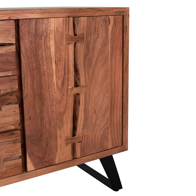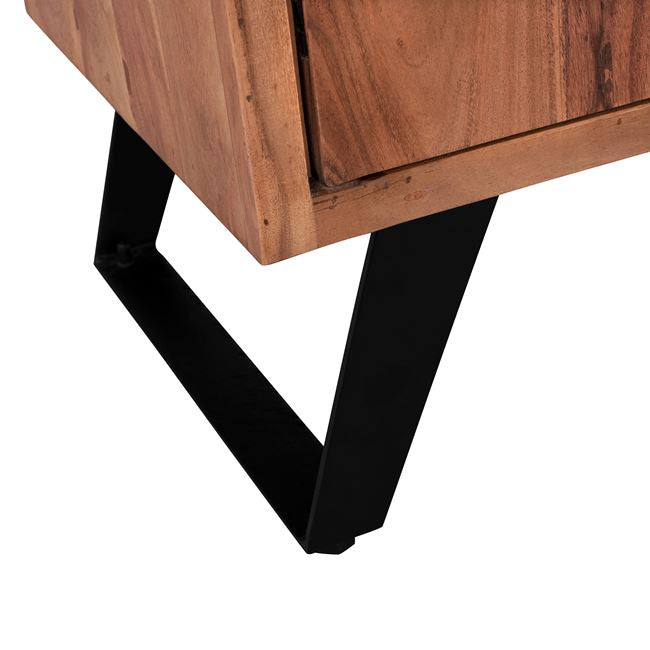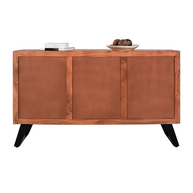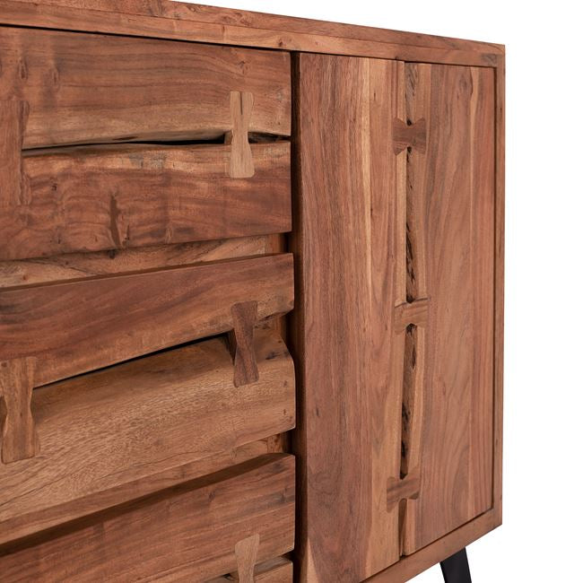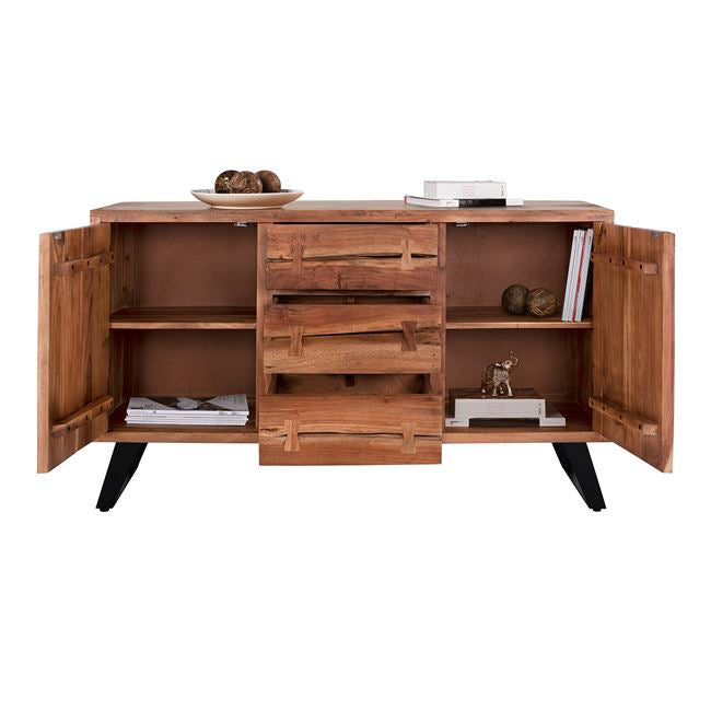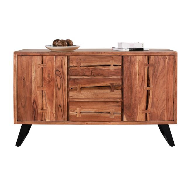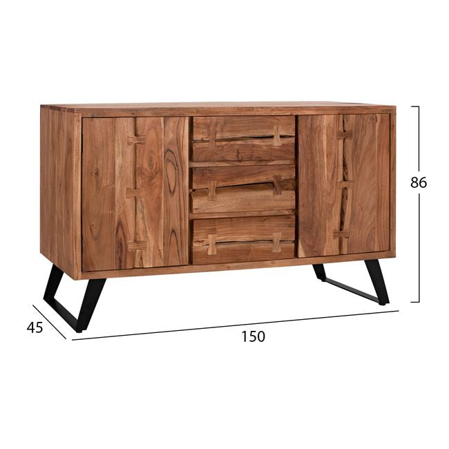 Открийте уникалния ръчно изработен бюфет КГ8176 от естествено масивно акациево дърво! Вечна мебел, която издържа изпитанието на времето, с отлично покритие, вдъхновено от природата, където дървото играе водеща роля. Бюфет от масивно акациево дърво в естествен нюанс и метални крака в черно. Разполага с 2 големи шкафа и 3 чекмеджета за съхранение на вашите неща. Размери: 150х45х86 см. Забележка: Продуктът е изработен от естествено масивно акациево дърво и всеки е уникален поради неравностите на стволовете. Съществуващите пукнатини или тези, които могат да се образуват с течение на времето се дължат на свиването-разширяването на живия организъм, наречен масивна дървесина, а не са производствен дефект, придавайки оригиналност и уникален дизайн на вашето пространство. По време на производствения процес съществуващите пукнатини се изглаждат и стабилизират с материал от същата дървесина. Поради това може да има цветови вариации и разлики в размерите на продукта поради размерите на обработената дървесина. Това не са дефект на продукта. Размери на опаковката: 1.55x 0.51x 0.7 cm Бруто тегло: 89 kg Нетно тегло: 77 kg