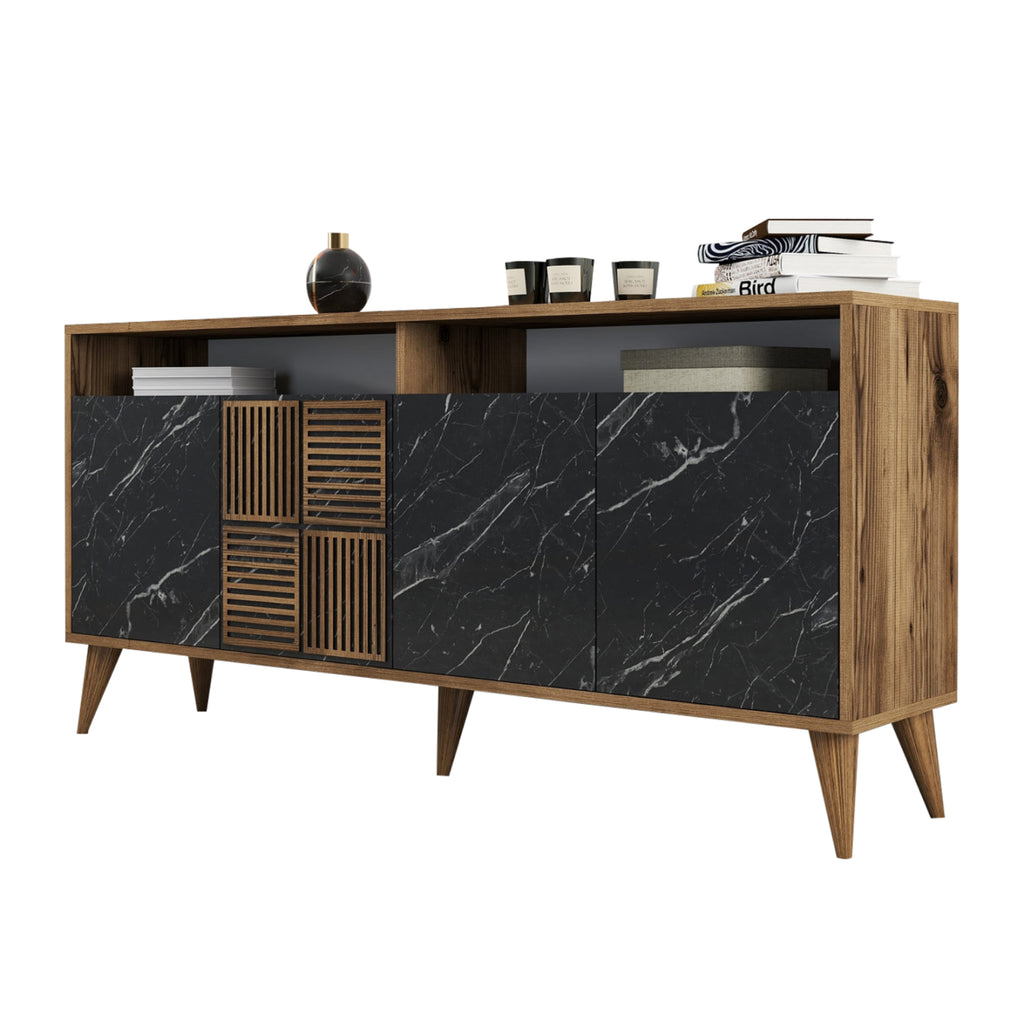 Бюфетът КГ9506.02 е внушителна мебел, където и да го поставите. Той има високи и наклонени крака в орехов нюанс и два големи шкафа с рафт, които се отварят с двойни врати. Точно над шкафовете и под горната повърхност има отворено пространство за съхранение. Дължината му гарантира, че повърхността му е голяма и достатъчна за поставяне на много предмети. Цветът на цялата конструкция е орех, а всички врати имат ЧЕРЕН мраморен ефект. Всъщност едната врата също има орехови детайли. Този бюфет ще ви развълнува! Но какво е бюфет? Бюфетът е изключително практична мебел, тъй като в неговите пространства за съхранение можем да поставим всичко – от съдове и чаши, до свещи и различни други полезни предмети, които имаме в дома си, така че да са подредени и да не създават безпорядък в пространството.
