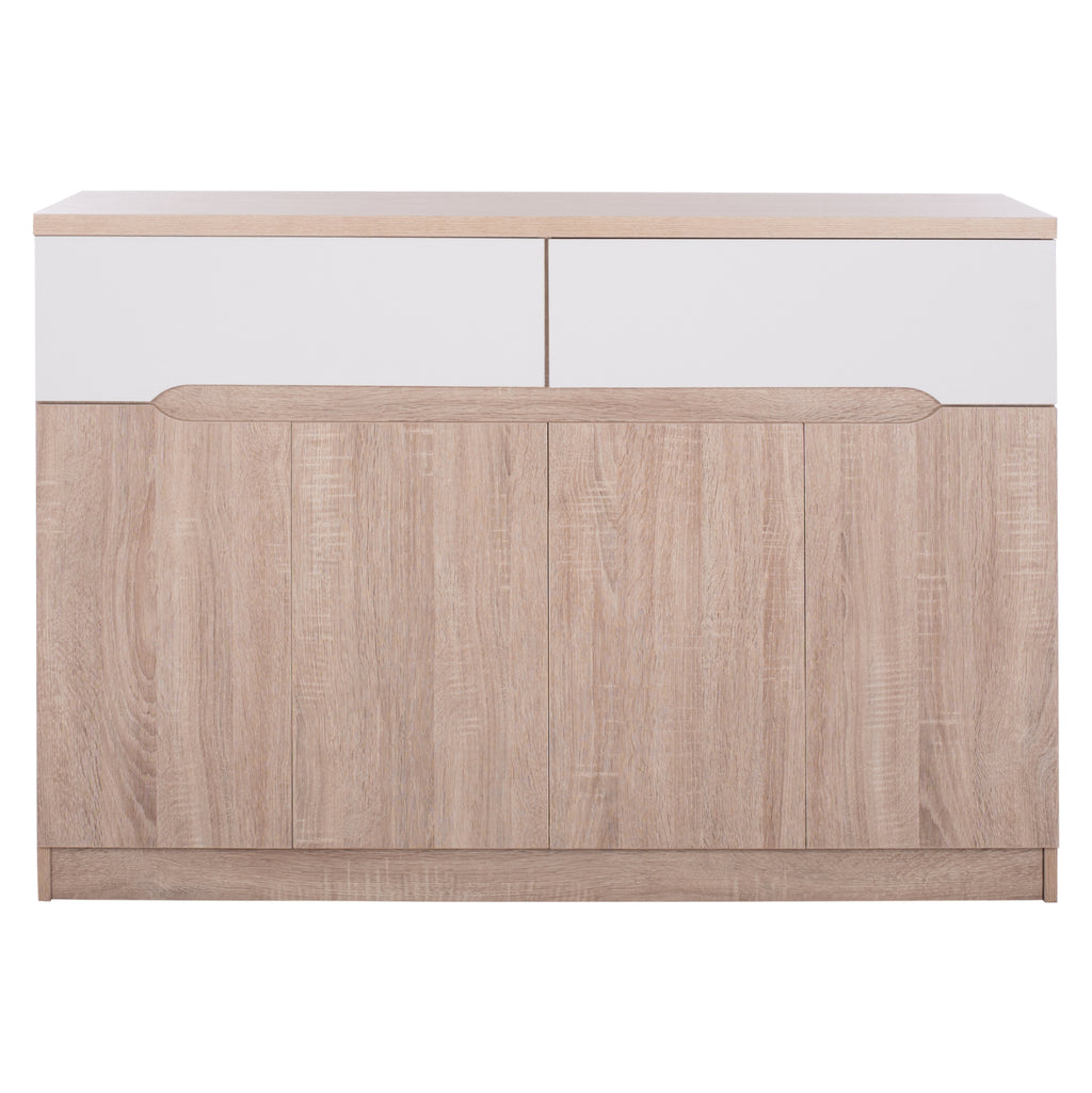 Бюфет в нюанс сонама с бяло, който ще завърши естетиката на вашето пространство, като същевременно ще ви предложи допълнителни пространства за излагане и съхранение на вещи. Функционално предложение за декорация на вашия хол или всекидневна. Има две чекмеджета, четири шкафа и отворена повърхност за съхранение на дребни вещи. Изработен от меламин с отлично качество, устойчив на износване и време. Размери: 120х40х80 см. Размери на чекмеджето: 52x32x13 см. (x2) Рафтове Размери: 57.5x37x23.5см. (x4) Европейско производство и произход. Продуктът се предлага разглобен във фабрична опаковка.
