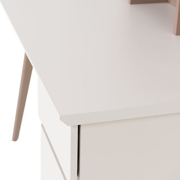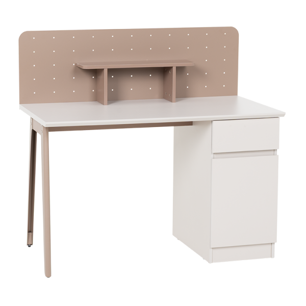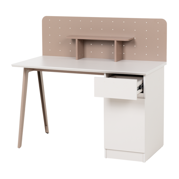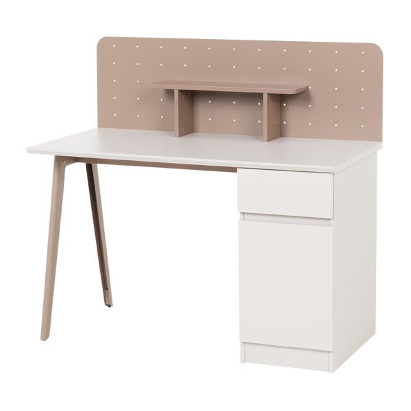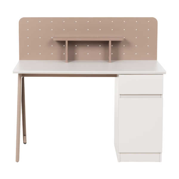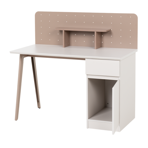 Бюро BAIS впечатлява с изчистен и модерен дизайн, който се вписва отлично както в детски, така и в юношески интериор. Практичното разпределение включва чекмедже и шкаф с вратичка, които осигуряват място за съхранение на учебни материали и аксесоари. Бледорозовият гръб с декоративни отвори и малък рафт допринася не само за функционалността, но и за естетиката на бюрото. Детайлите в пастелни тонове и наклонените крака придават характер и създават усещане за уют.