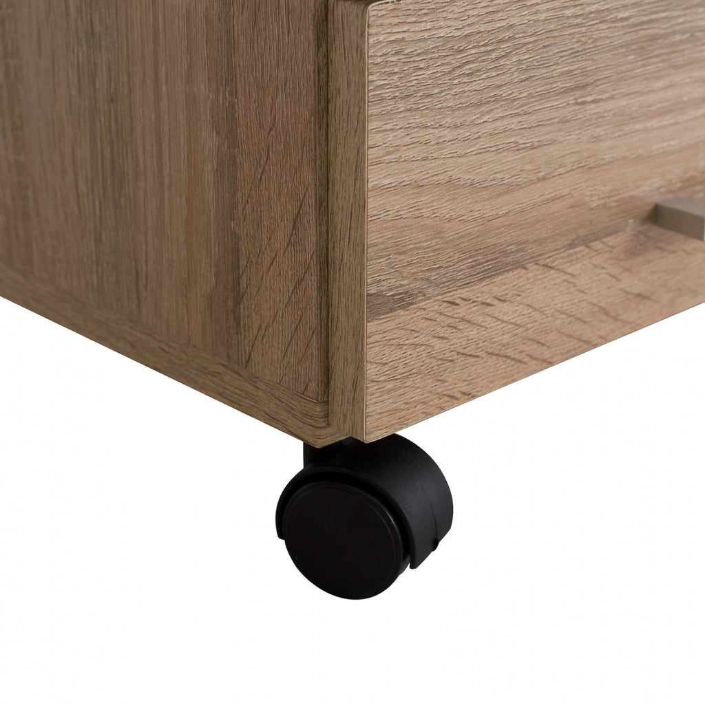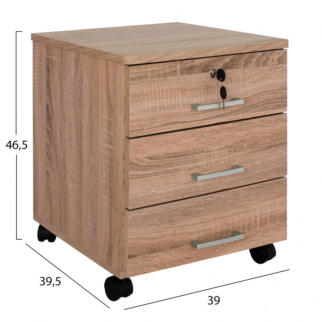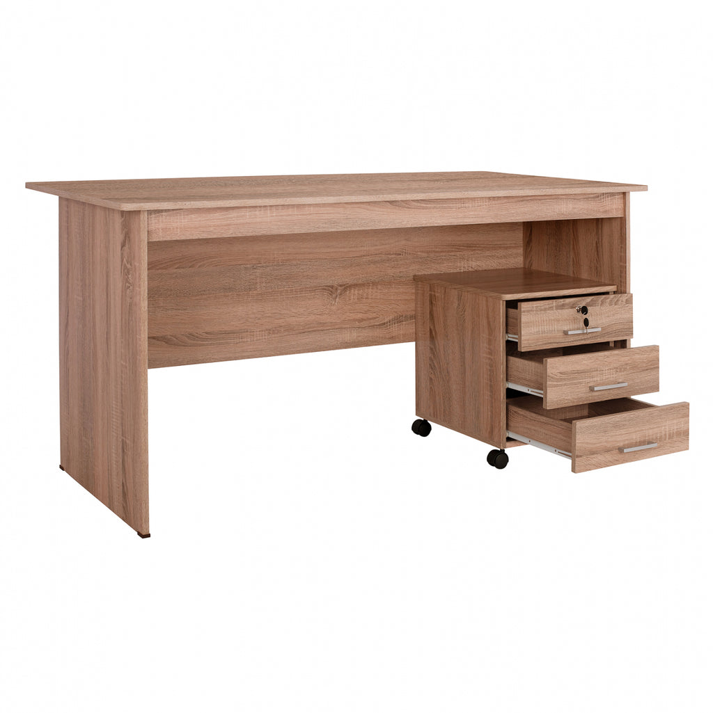Офис комплект от 2 части, състоящ се от меламиново бюро с елегантен и семпъл дизайн, изработено от здрав меламин в цвят sonama и офис скрин в цвят sonama, с ключалка. Размери на бюрото: 150х71х74.5см. Размери на скрина: 39х39,5х46,5см. Продуктът се предлага разглобен в опаковка.