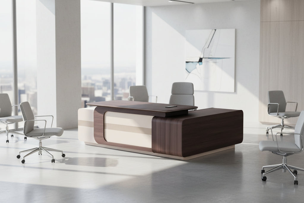 Бюрото е с меламиново покритие в орех и бежов цвят. То е модерно и функционално решение за професионални, предимно офис пространства. Дизайнът му съчетава меламин в цвят орех с елегантни бежови детайли, създавайки изискан и професионален резултат. Има отвор на повърхността за лесен достъп и правилна организация на кабелите, а пространствата за съхранение са завършени и практични.