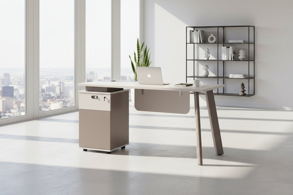 Професионално бюро с шкаф отляво NEWLINE в екрю и светлокафяво Професионалното бюро NEWLINE има шкаф от лявата страна, докато седите, и предлага сравнително малка, но удобна работна повърхност с модерна естетика. Комбинацията от меламин в екрю и светлокафяво създава ярък и елегантен резултат, подходящ за модерни офиси и домашни офиси с високи изисквания. Разполага с кръгъл отвор на повърхността за правилно управление на кабелите и чисто работно място. Шкафът от лявата страна няма рафтове, но има чекмедже с 3-цифрена кодова ключалка отгоре. 2-та алуминиеви крака в светлокафяво добавят стабилност и модерен характер. ______________________________________ Характеристики на продукта • Професионално бюро с шкаф от лявата страна • Меламин в екрю и светлокафяво • 2 алуминиеви крака в светлокафяво • Кръгъл отвор на повърхността за управление на кабелите • Шкаф без рафтове • Чекмедже с 3-цифрена кодова ключалка • Дълбоко чекмедже със скрита дръжка • Отворено пространство за съхранение зад шкафа ______________________________________ Размери • Общи размери: 120x60x75H см. _____________________________________ Строителни материали • Повърхности и корпус, изработени от издръжлив висококачествен меламин • Алуминиеви крака за стабилност и издръжливост __________________________________________ Поддръжка • Почиствайте с мека, леко влажна кърпа • Избягвайте абразивни материали и силни почистващи препарати • Подсушавайте повърхността след почистване __________________________________________ Предимства • Стандартна, но ергономична работна повърхност • Пълна организация с чекмедже и шкаф • Сигурно съхранение с кодова ключалка • Отлично управление на кабели и електрическо оборудване • Модерен дизайн за професионални пространства ------------------------------------------------------------------------------------------------------------------ ---***ПРОДУКТЪТ ТРЯБВА ДА СЕ СГЛОБЯВА САМО ОТ КВАЛИФИЦИРАНИ ТЕХНИЦИ***--- ** Цветопредаването на продукта може леко да се различава от фотографското му представяне на вашия екран.