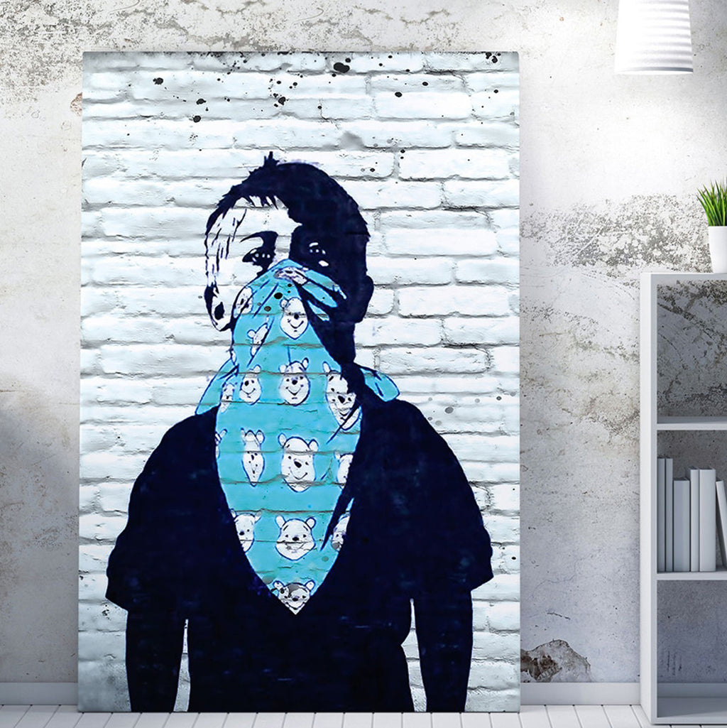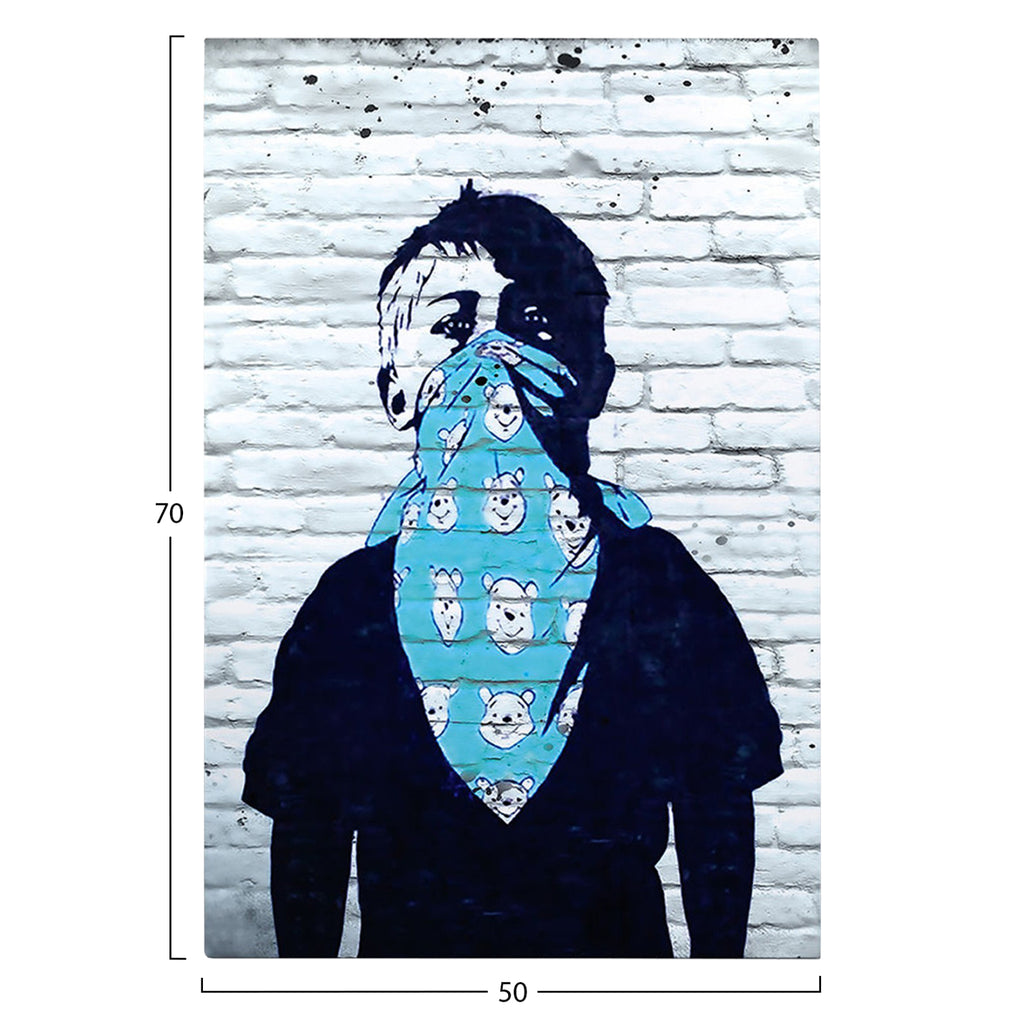 Стенописът трансформира начина, по който възприемаме пространството. И така, украсете вашето пространство с новата серия картини за стена GOBI! Тази цветна картина, изобразяваща маскирано дете със син шал, е реализирана върху дигитално отпечатано платно (50% памук-50% полиестер) върху дървена рамка. (Дизайнер: Banksy) РАЗМЕРИ: 50x3(дебелина)x70H cm. Рамка: 2х3 см. ГРИЖА: Почистване от прах при нужда. Не използвайте вода или химически почистващи препарати. ** Цветопредаването на продукта може леко да се различава от неговото фотографско представяне на вашия екран.