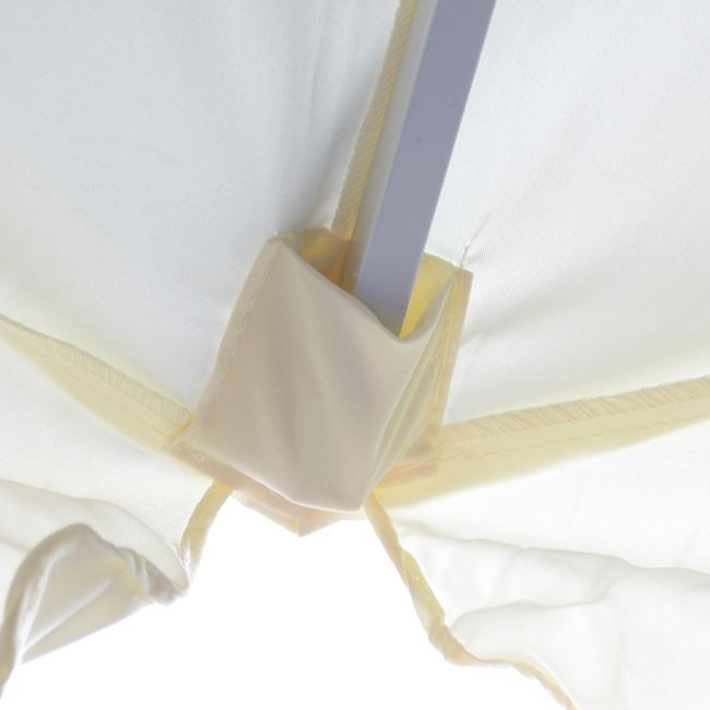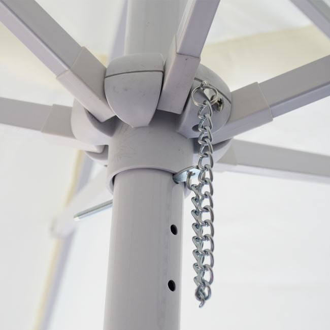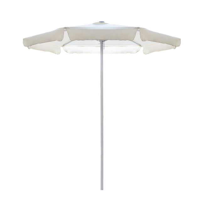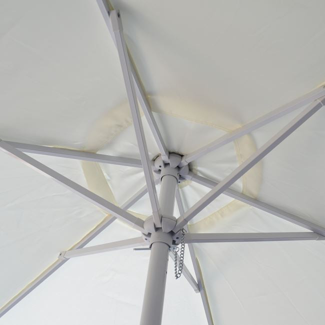 Кръгъл чадър φ2.00м. диаметър и височина 2,40м. с въздуховод. С метална тръба от една част Φ38mm. с 6 железни спици 12х18см. и шпилка за закрепване в три позиции. Водоотблъскващ полиестерен плат 240 грама с капаци 17 см. Подходящ за плажен бар. Чадърът е подходящ за използване на открито. При нестабилно време чадърът трябва да бъде затворен. Чадърът не подлежи на ремонт.