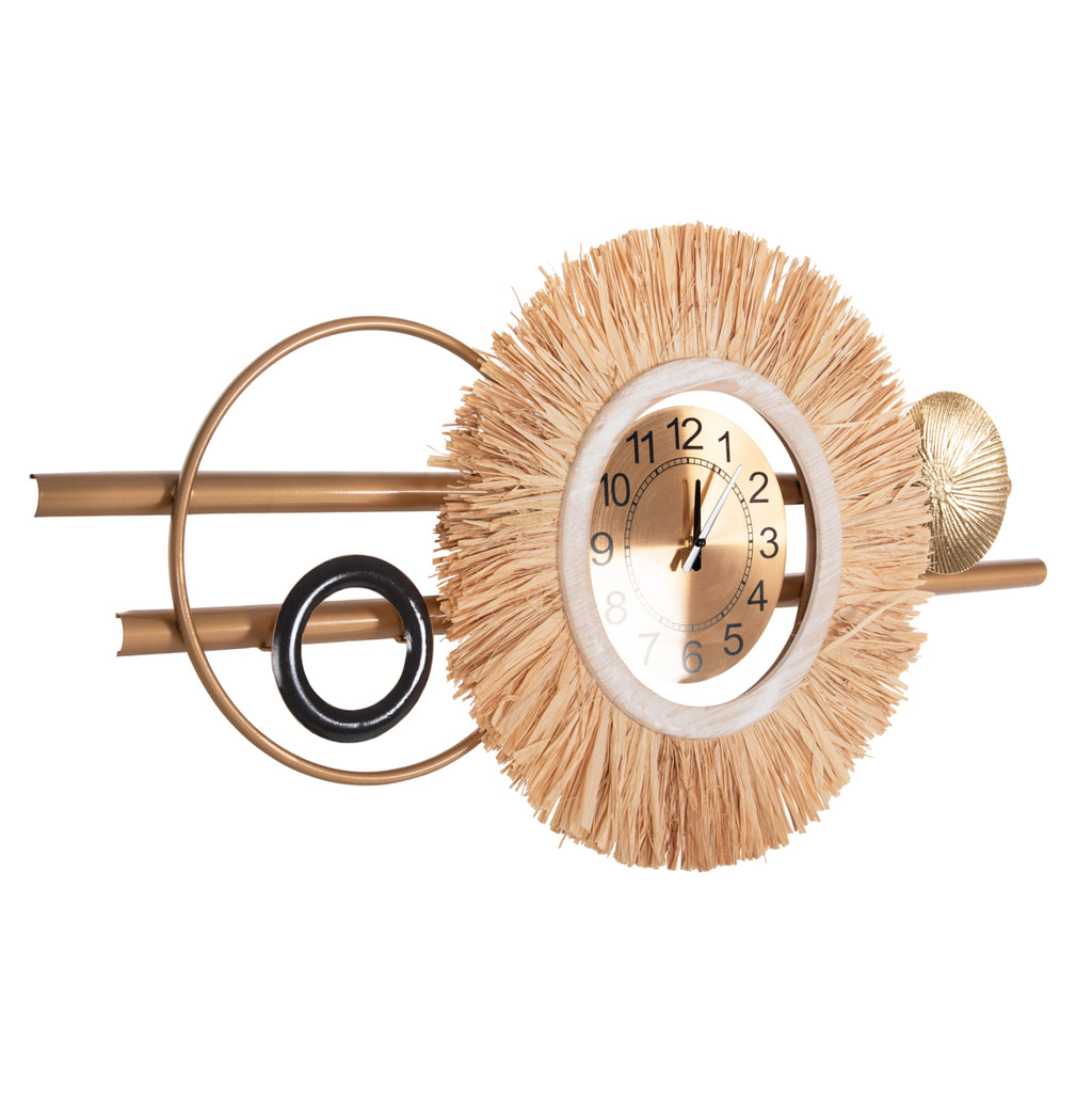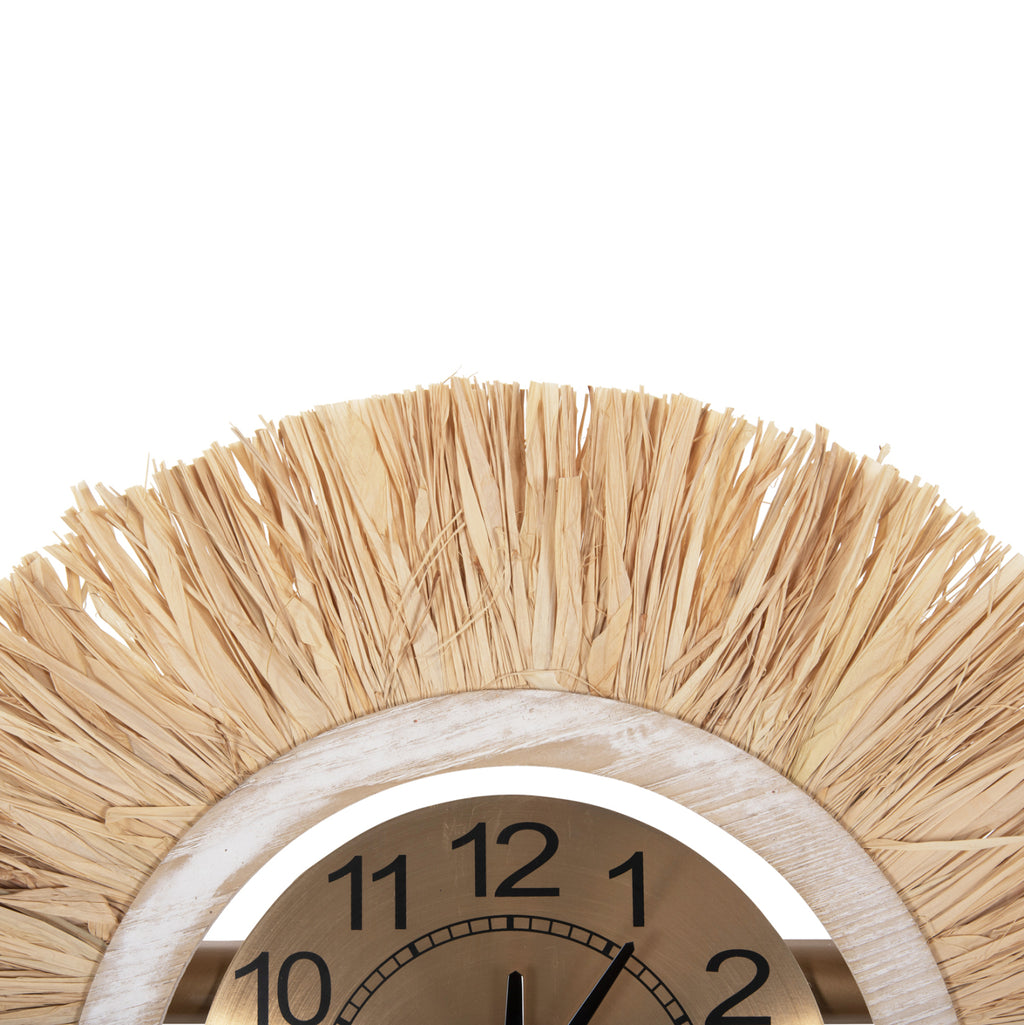 Красиво и основно естетическо, както и утилитарно допълнение за всяка стая във вашия дом или бизнес. Стенен часовник е класическа декоративна идея, която никога няма да остарее. Този часовник е част от декоративен комплект от метал в цвят EARTH с кръгла часовникова рамка, изработена от изсушени влакна рафия. Влакната от рафия се получават чрез белене на палмови листа от рафия. Рафийните палми са род от около двадесет вида палми, произхождащи от тропическите региони на Африка, особено Мадагаскар, като един вид се среща и в Централна и Южна Америка. Влакното от рафия е меко, гъвкаво, здраво и издръжливо. РАЗМЕРИ: 100х49Н см. ПОДДРЪЖКА: Редовното почистване на прах ще запази часовника ви да изглежда като нов. ** Цветопредаването на продукта може леко да се различава от неговото фотографско представяне на вашия екран.