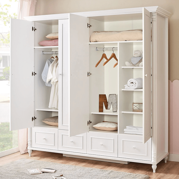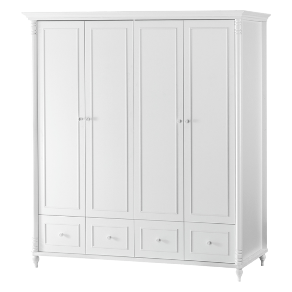 Колекцията бебешко обзавеждане предлага голям четирикрилен гардероб с 4 чекмеджета в долната част. В едната половина на гардероба има лост за закачалки и 2 рафта под и над него. Другата половина е разделена на 2 отделения – едно изцяло с рафтове и второ с още един по-малък лост за закачалки.